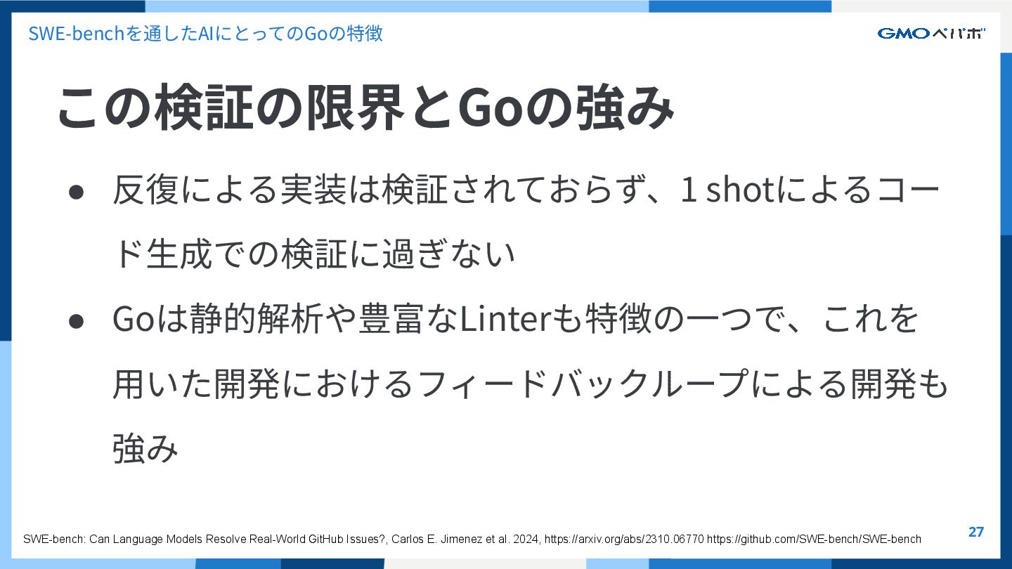 強み SWE-bench: Can Language Models Resolve Real-World GitHub Issues?, Carlos E. Jimenez et al. 2024, https://arxiv.org/abs/2310.06770 https://github.com/SWE-bench/SWE-bench