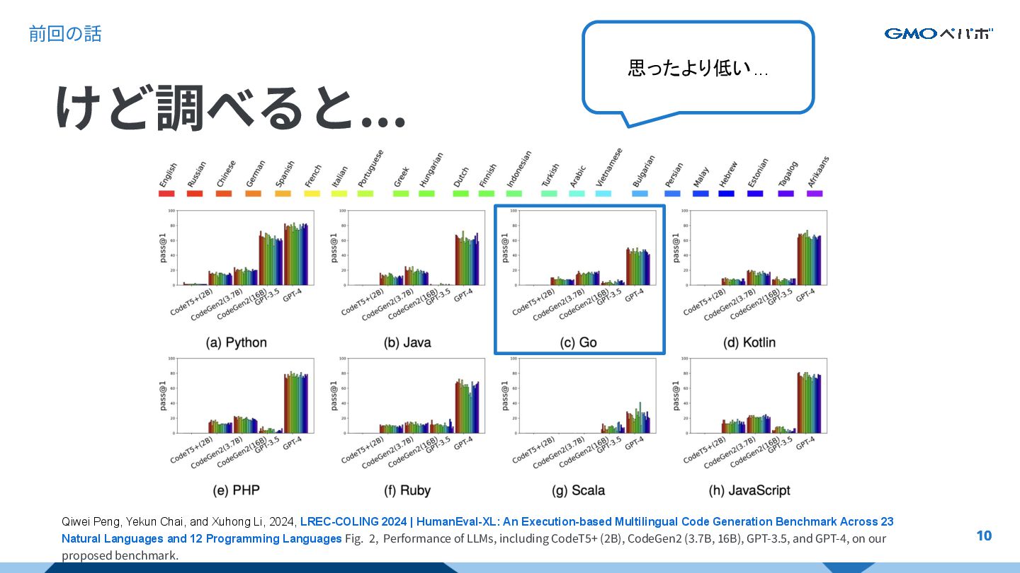 2024, LREC-COLING 2024 | HumanEval-XL: An Execution-based Multilingual Code Generation Benchmark Across 23 Natural Languages and 12 Programming Languages Fig. 2, Performance of LLMs, including CodeT5+ (2B), CodeGen2 (3.7B, 16B), GPT-3.5, and GPT-4, on our proposed benchmark. 思ったより低い... 前回の話