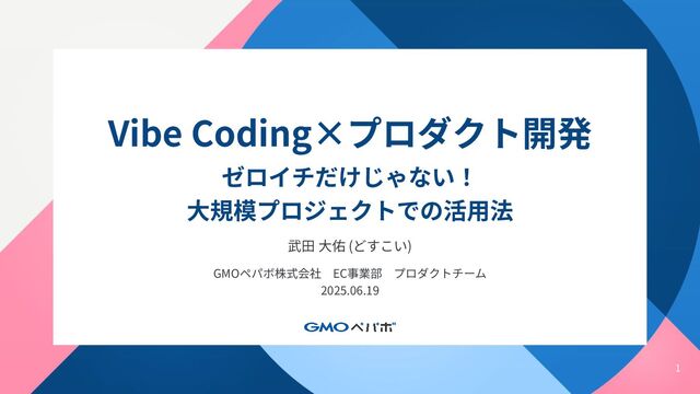 1 Vibe Coding×プロダクト開発 ゼロイチだけじゃない! ⼤規模プロジェクトでの活⽤法 武⽥ ⼤佑 (どすこい) GMOペパボ株式会社 EC事業部 プロダクトチーム 2025.06.19