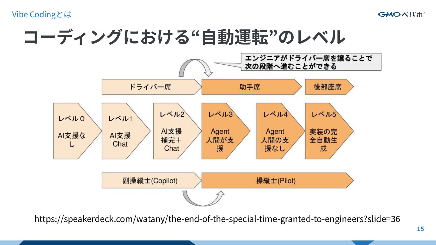 15 Vibe Codingとは コーディングにおける“⾃動運転”のレベル https://speakerdeck.com/watany/the-end-of-the-special-time-granted-to-engineers?slide=36