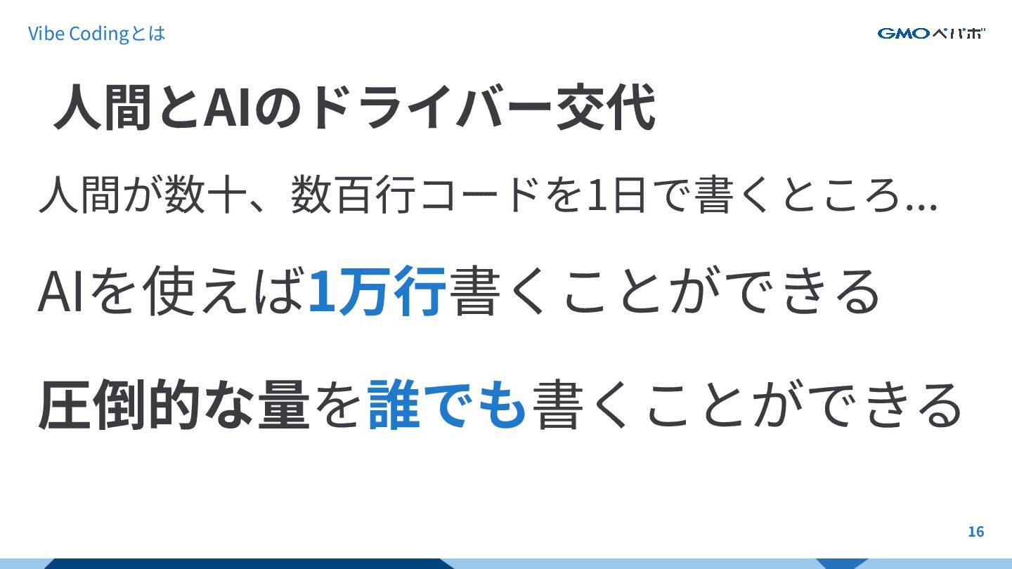 16 ⼈間が数⼗、数百⾏コードを1⽇で書くところ... AIを使えば1万⾏書くことができる 圧倒的な量を誰でも書くことができる ⼈間とAIのドライバー交代 Vibe Codingとは