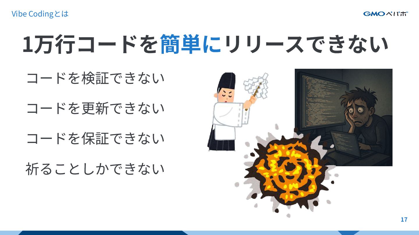 17 コードを検証できない コードを更新できない コードを保証できない 祈ることしかできない 1万⾏コードを簡単にリリースできない Vibe Codingとは