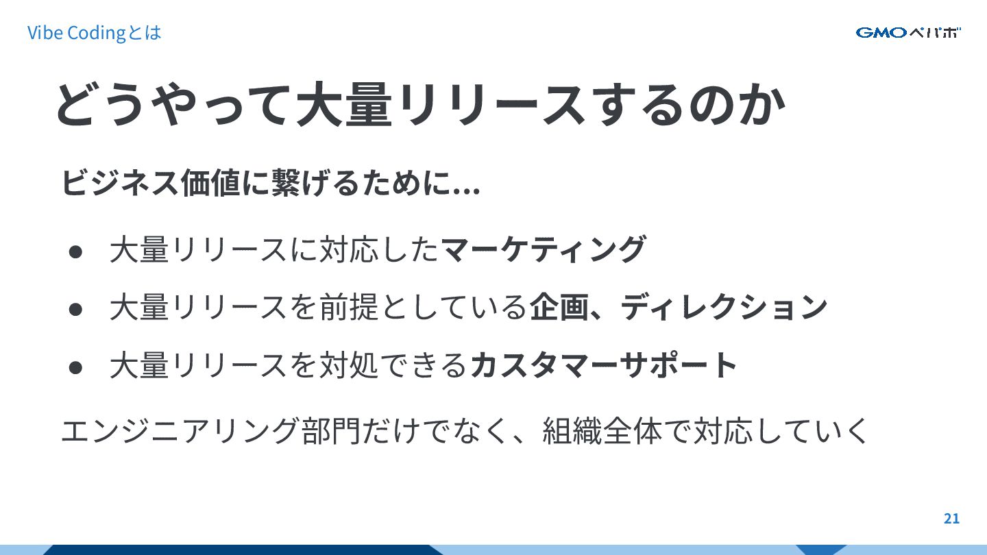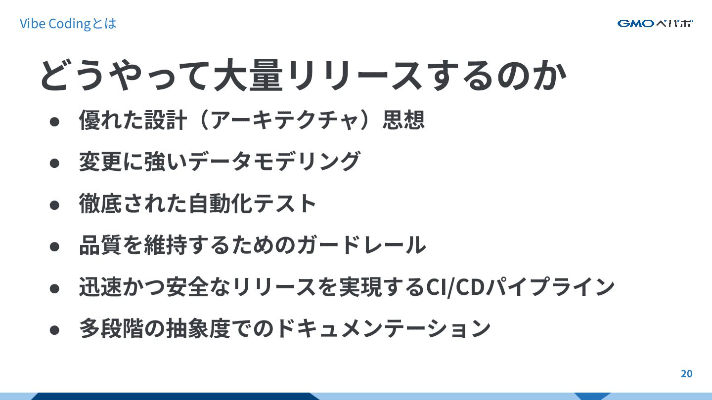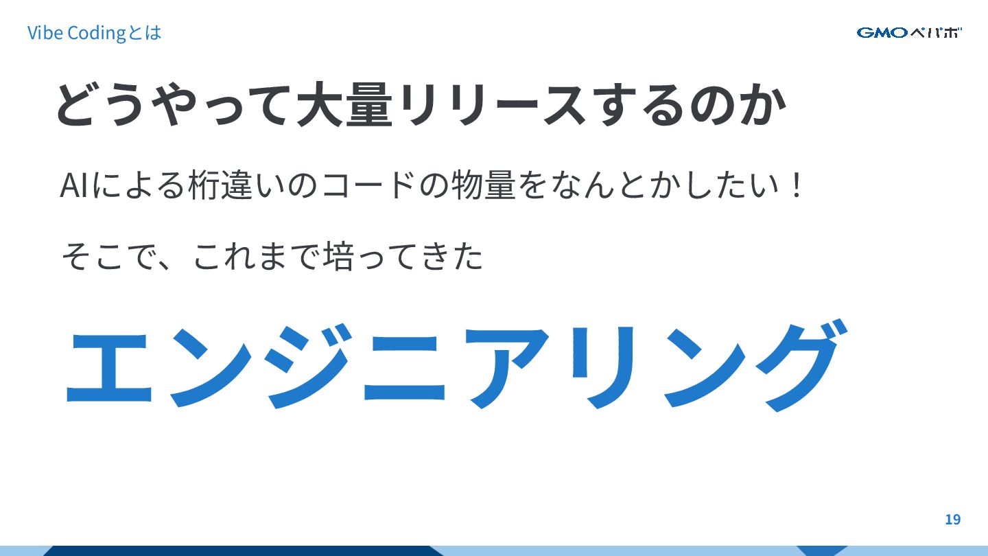 19 AIによる桁違いのコードの物量をなんとかしたい! そこで、これまで培ってきた エンジニアリング どうやって⼤量リリースするのか Vibe Codingとは