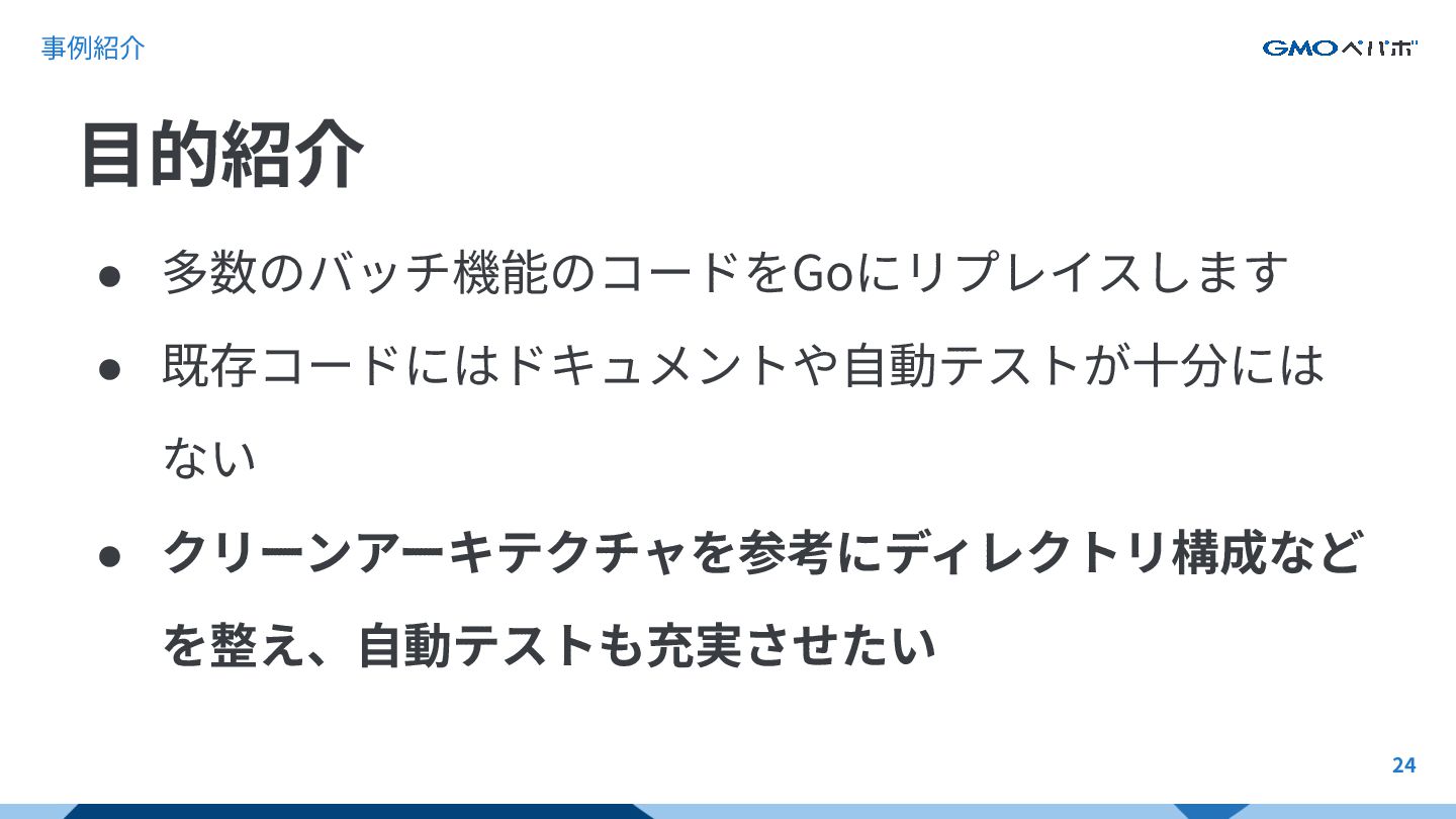 事例紹介 • 多数のバッチ機能のコードをGoにリプレイスします • 既存コードにはドキュメントや⾃動テストが⼗分には ない • クリーンアーキテクチャを参考にディレクトリ構成など を整え、⾃動テストも充実させたい ⽬的紹介