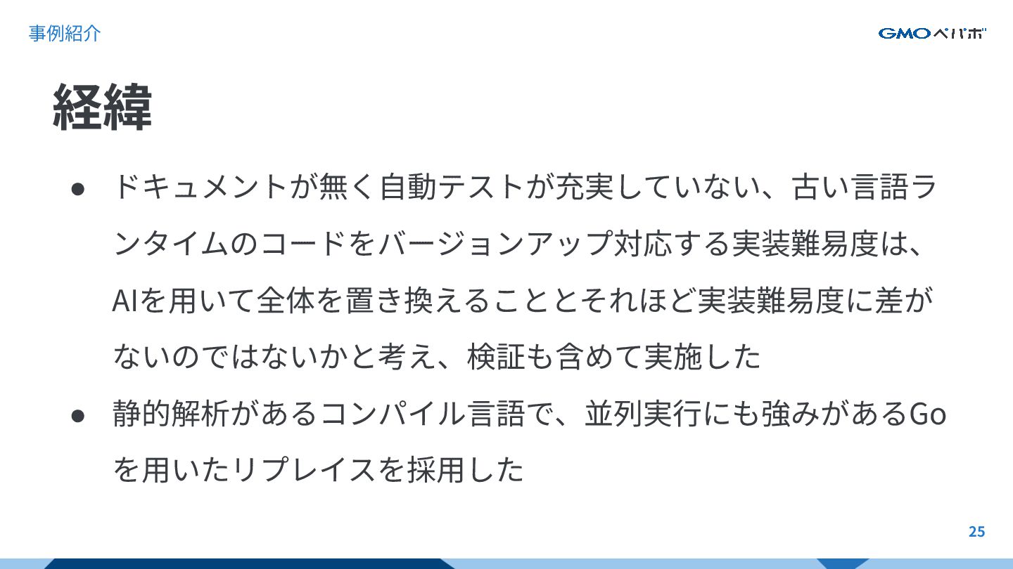 事例紹介 • ドキュメントが無く⾃動テストが充実していない、古い⾔語ラ ンタイムのコードをバージョンアップ対応する実装難易度は、 AIを⽤いて全体を置き換えることとそれほど実装難易度に差が ないのではないかと考え、検証も含めて実施した • 静的解析があるコンパイル⾔語で、並列実⾏にも強みがあるGo を⽤いたリプレイスを採⽤した 経緯