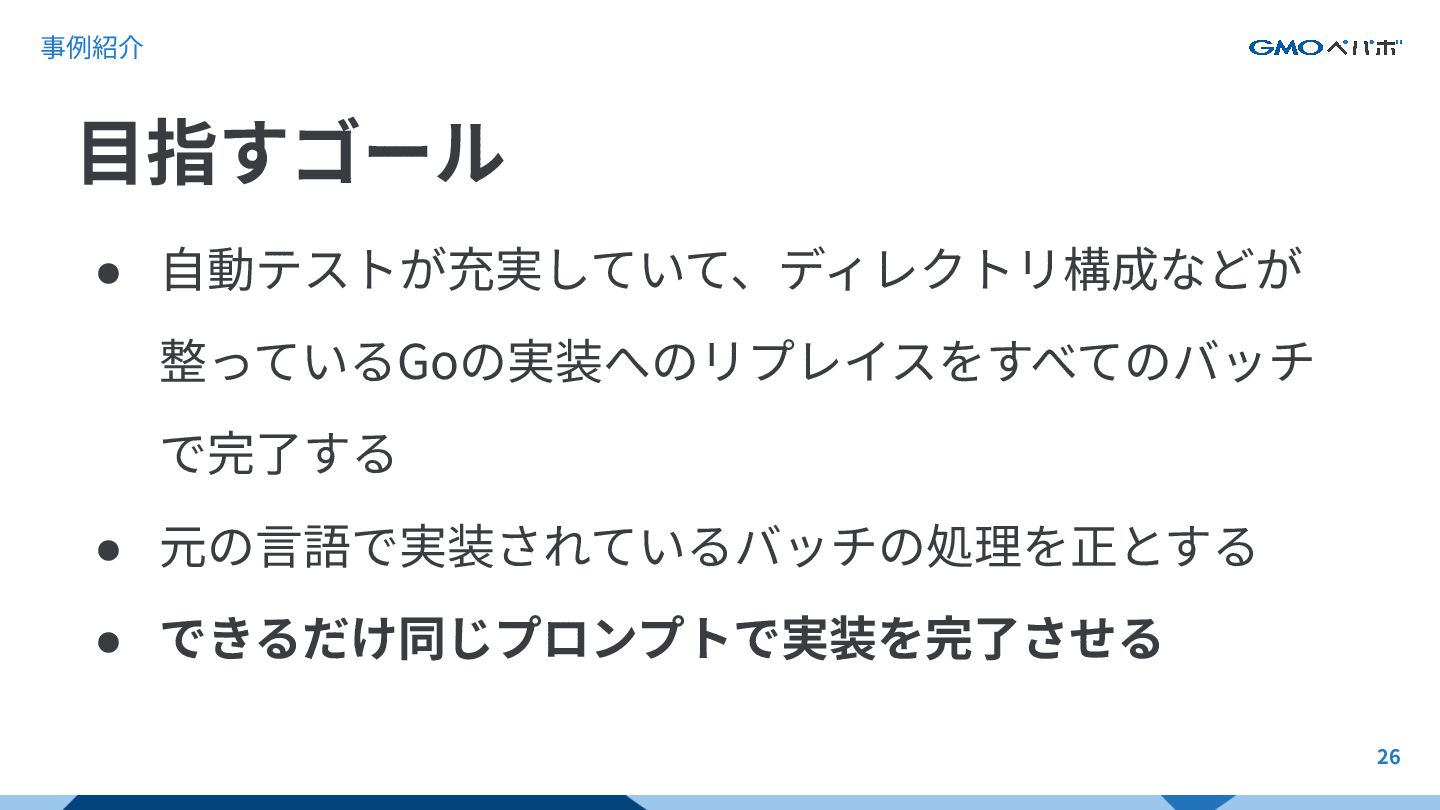 事例紹介 • ⾃動テストが充実していて、ディレクトリ構成などが 整っているGoの実装へのリプレイスをすべてのバッチ で完了する • 元の⾔語で実装されているバッチの処理を正とする • できるだけ同じプロンプトで実装を完了させる ⽬指すゴール
