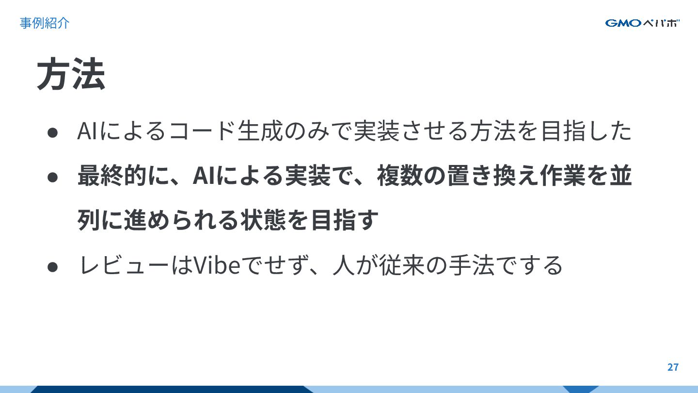 事例紹介 • AIによるコード⽣成のみで実装させる⽅法を⽬指した • 最終的に、AIによる実装で、複数の置き換え作業を並 列に進められる状態を⽬指す • レビューはVibeでせず、⼈が従来の⼿法でする ⽅法 27