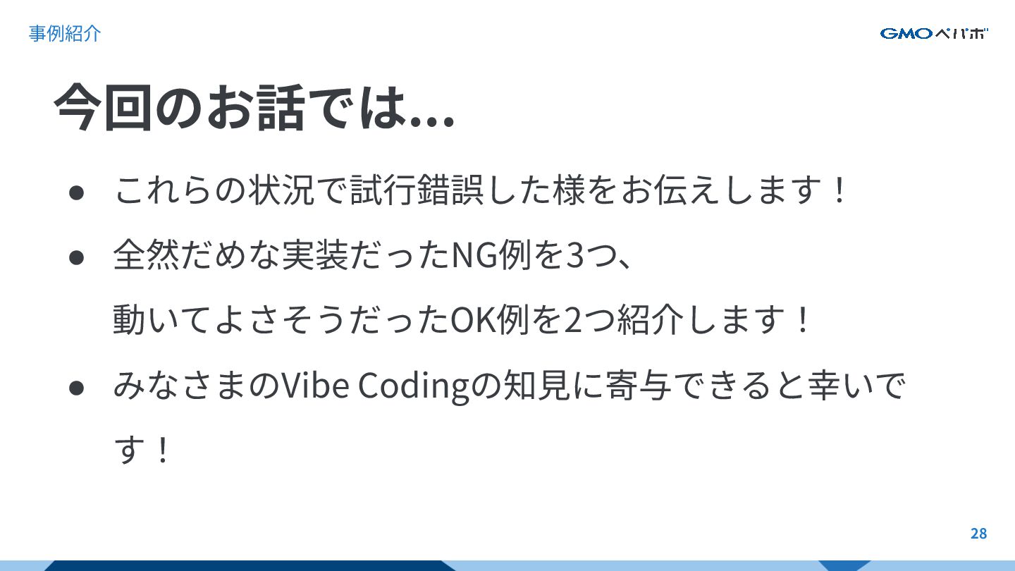 事例紹介 • これらの状況で試⾏錯誤した様をお伝えします! • 全然だめな実装だったNG例を3つ、 動いてよさそうだったOK例を2つ紹介します! • みなさまのVibe Codingの知⾒に寄与できると幸いで す!