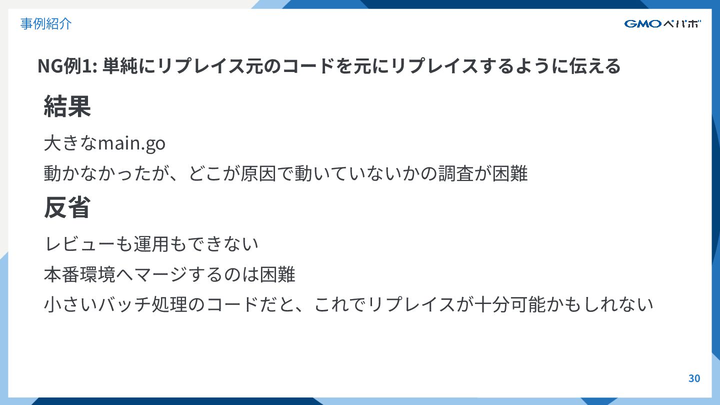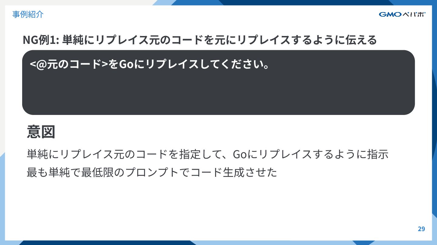 NG例1: 単純にリプレイス元のコードを元にリプレイスするように伝える 29 事例紹介 意図 単純にリプレイス元のコードを指定して、Goにリプレイスするように指⽰ 最も単純で最低限のプロンプトでコード⽣成させた <@元のコード>をGoにリプレイスしてください。