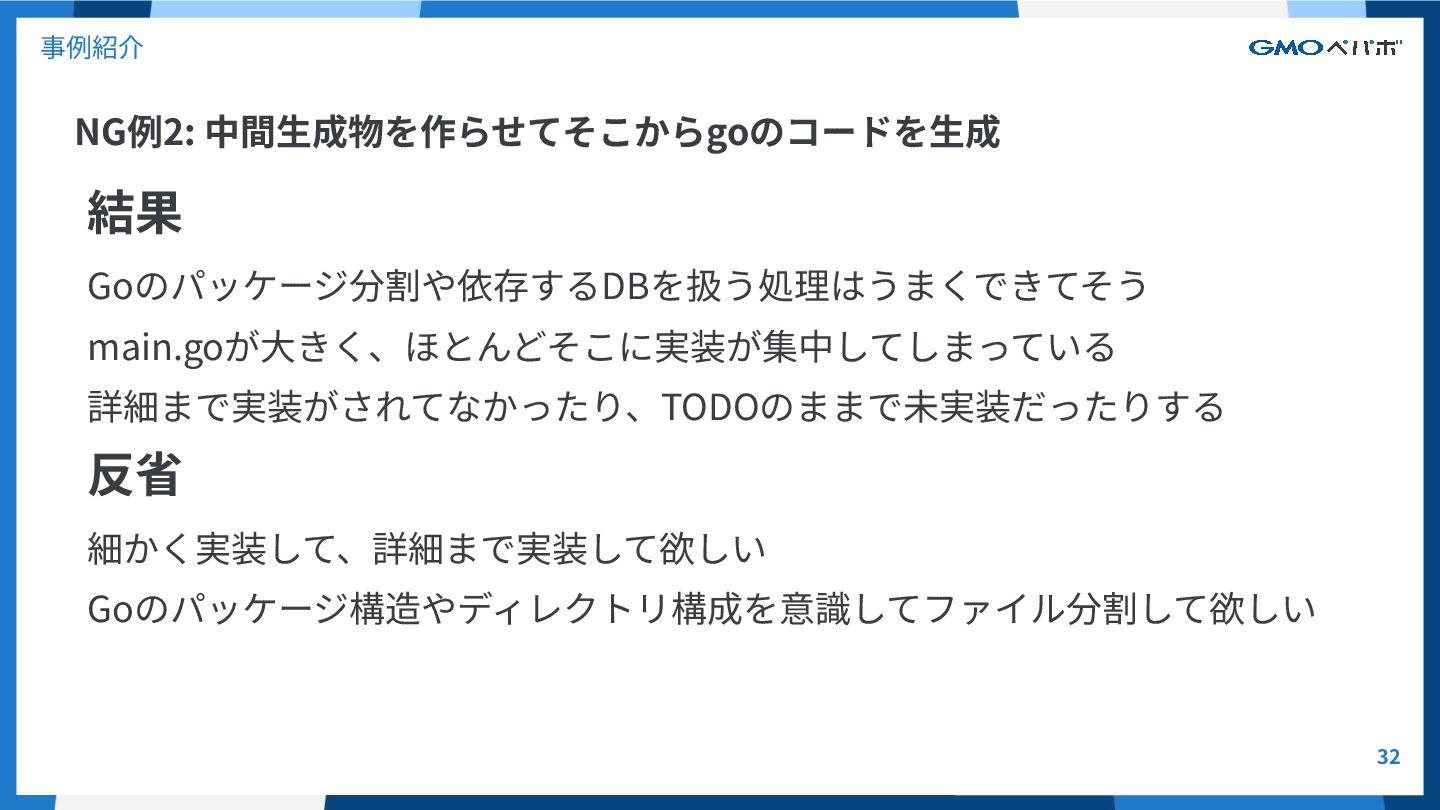 NG例2: 中間⽣成物を作らせてそこからgoのコードを⽣成 31 事例紹介 意図 ⼀度、仕様を⽂章にして、そこから新しくGoのコードを書かせた <@元のコード>のドキュメントをmdファイルに書いてください。 依存先、依存元や処理の詳細について書いてください。 <@中間⽣成物md>を参考に、Goへのリプレイスを書いてください。