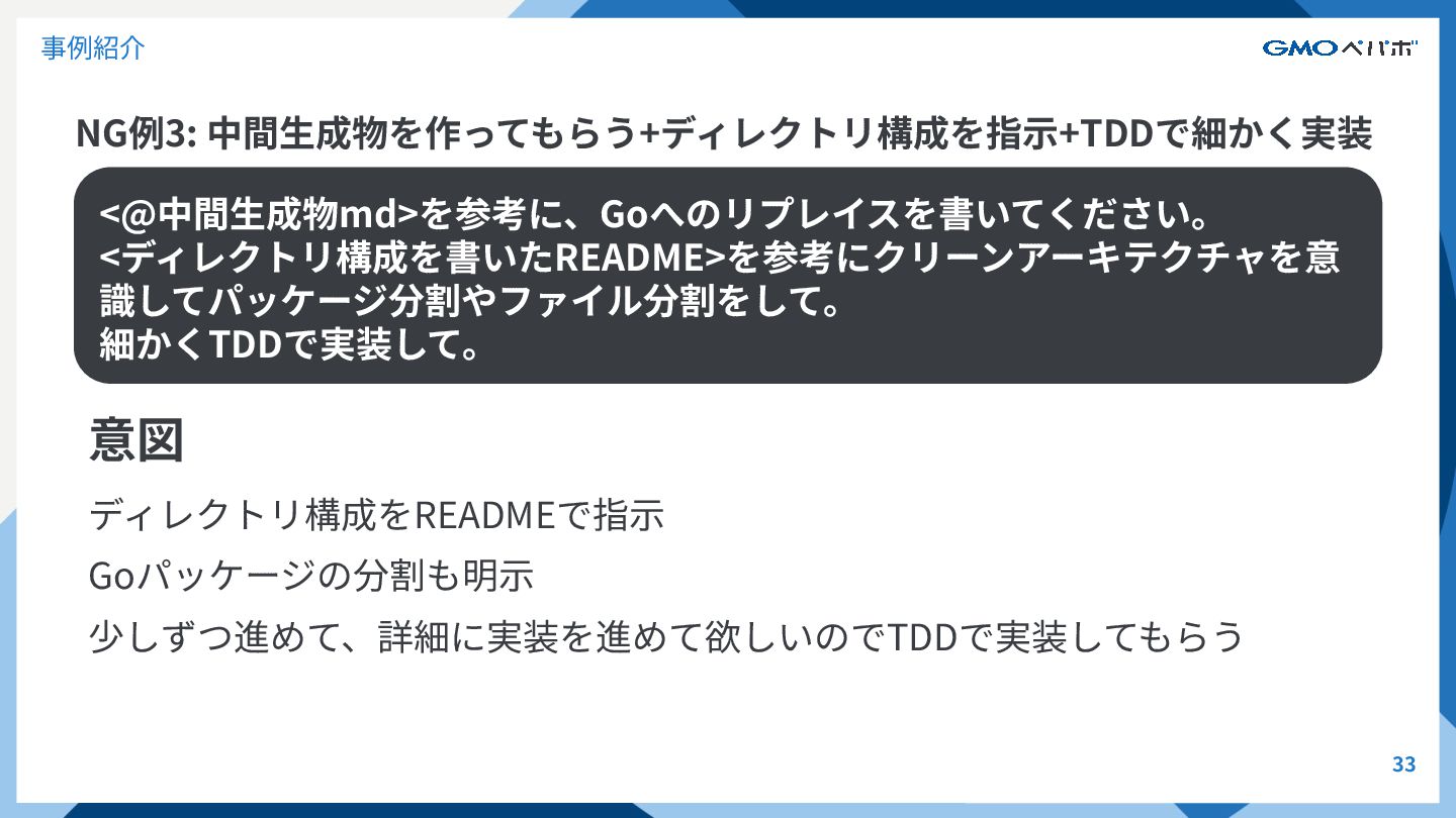 NG例2: 中間⽣成物を作らせてそこからgoのコードを⽣成 32 事例紹介 結果 Goのパッケージ分割や依存するDBを扱う処理はうまくできてそう main.goが⼤きく、ほとんどそこに実装が集中してしまっている 詳細まで実装がされてなかったり、TODOのままで未実装だったりする 反省 細かく実装して、詳細まで実装して欲しい