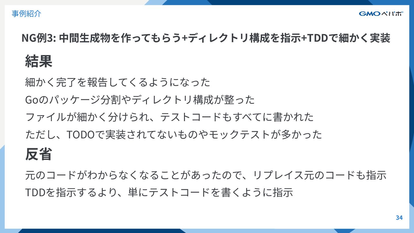 NG例3: 中間⽣成物を作ってもらう+ディレクトリ構成を指⽰+TDDで細かく実装 33 事例紹介 意図 ディレクトリ構成をREADMEで指⽰ Goパッケージの分割も明⽰ 少しずつ進めて、詳細に実装を進めて欲しいのでTDDで実装してもらう <@中間⽣成物md>を参考に、Goへのリプレイスを書いてください。 <ディレクトリ構成を書いたREADME>を参考にクリーンアーキテクチャを意