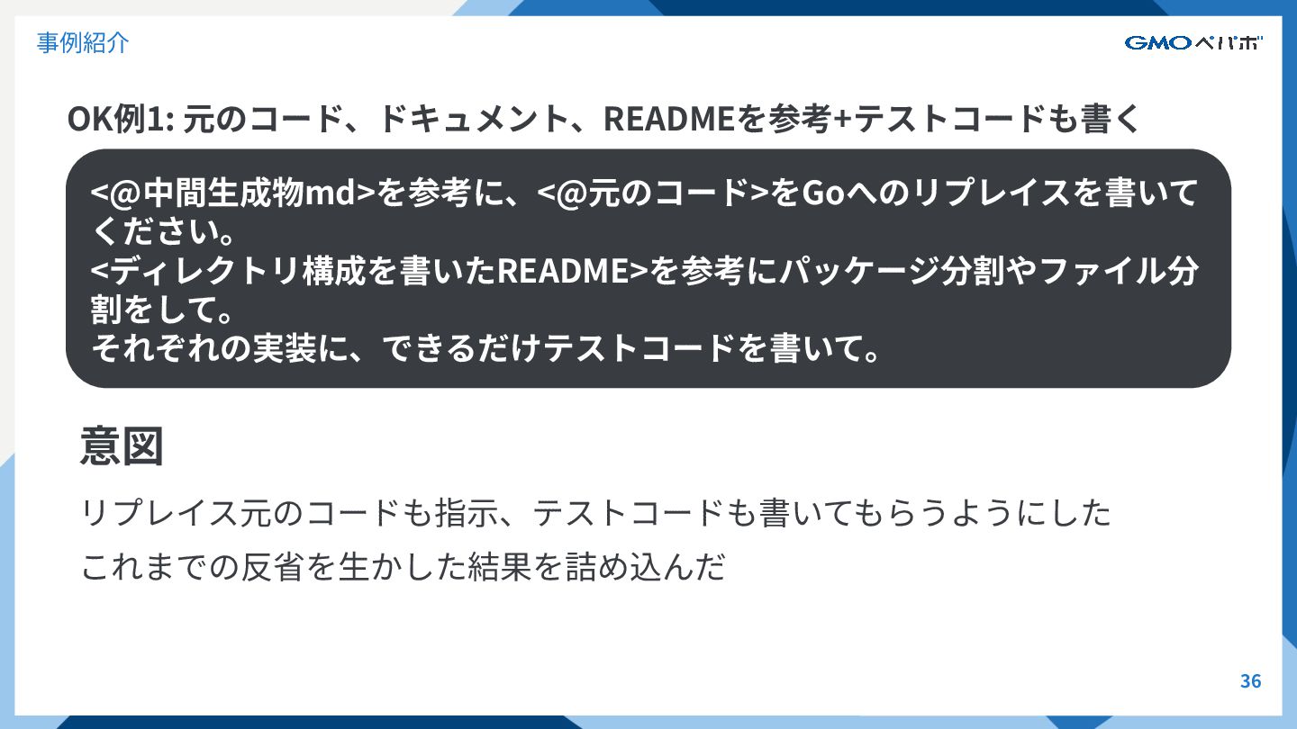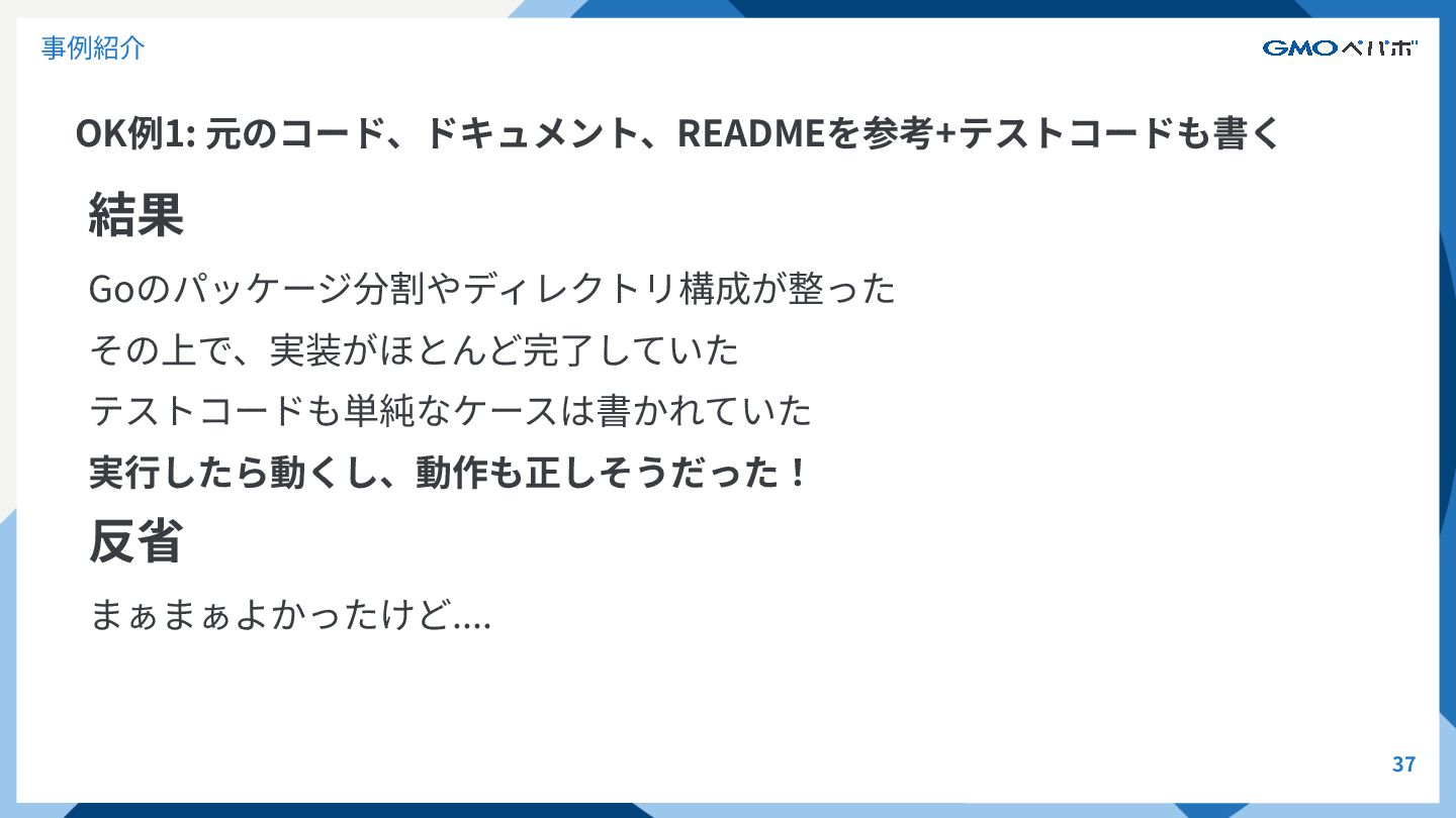 OK例1: 元のコード、ドキュメント、READMEを参考+テストコードも書く 36 事例紹介 意図 リプレイス元のコードも指⽰、テストコードも書いてもらうようにした これまでの反省を⽣かした結果を詰め込んだ <@中間⽣成物md>を参考に、<@元のコード>をGoへのリプレイスを書いて ください。 <ディレクトリ構成を書いたREADME>を参考にパッケージ分割やファイル分