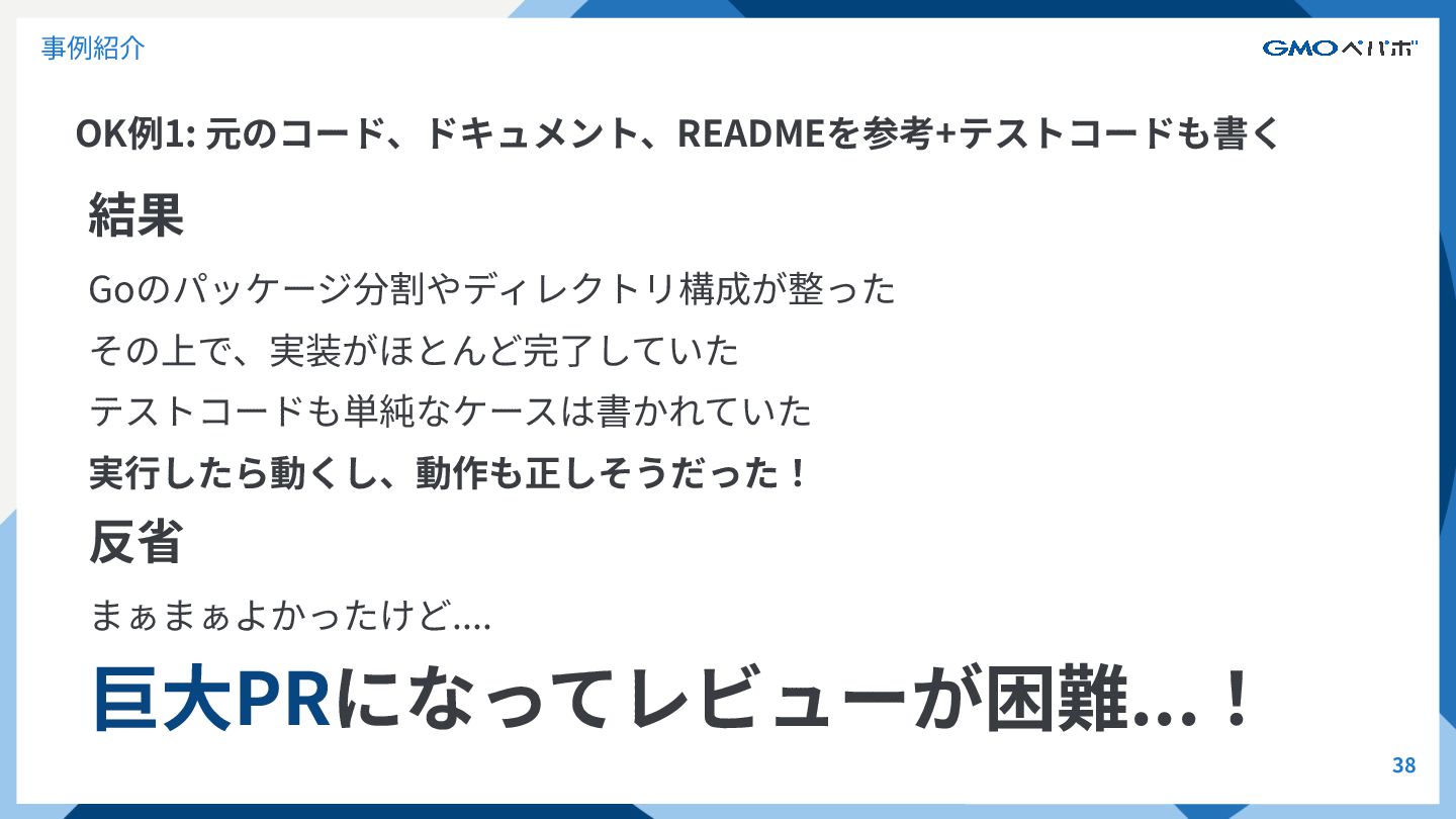 OK例1: 元のコード、ドキュメント、READMEを参考+テストコードも書く 37 事例紹介 結果 Goのパッケージ分割やディレクトリ構成が整った その上で、実装がほとんど完了していた テストコードも単純なケースは書かれていた 実⾏したら動くし、動作も正しそうだった! 反省