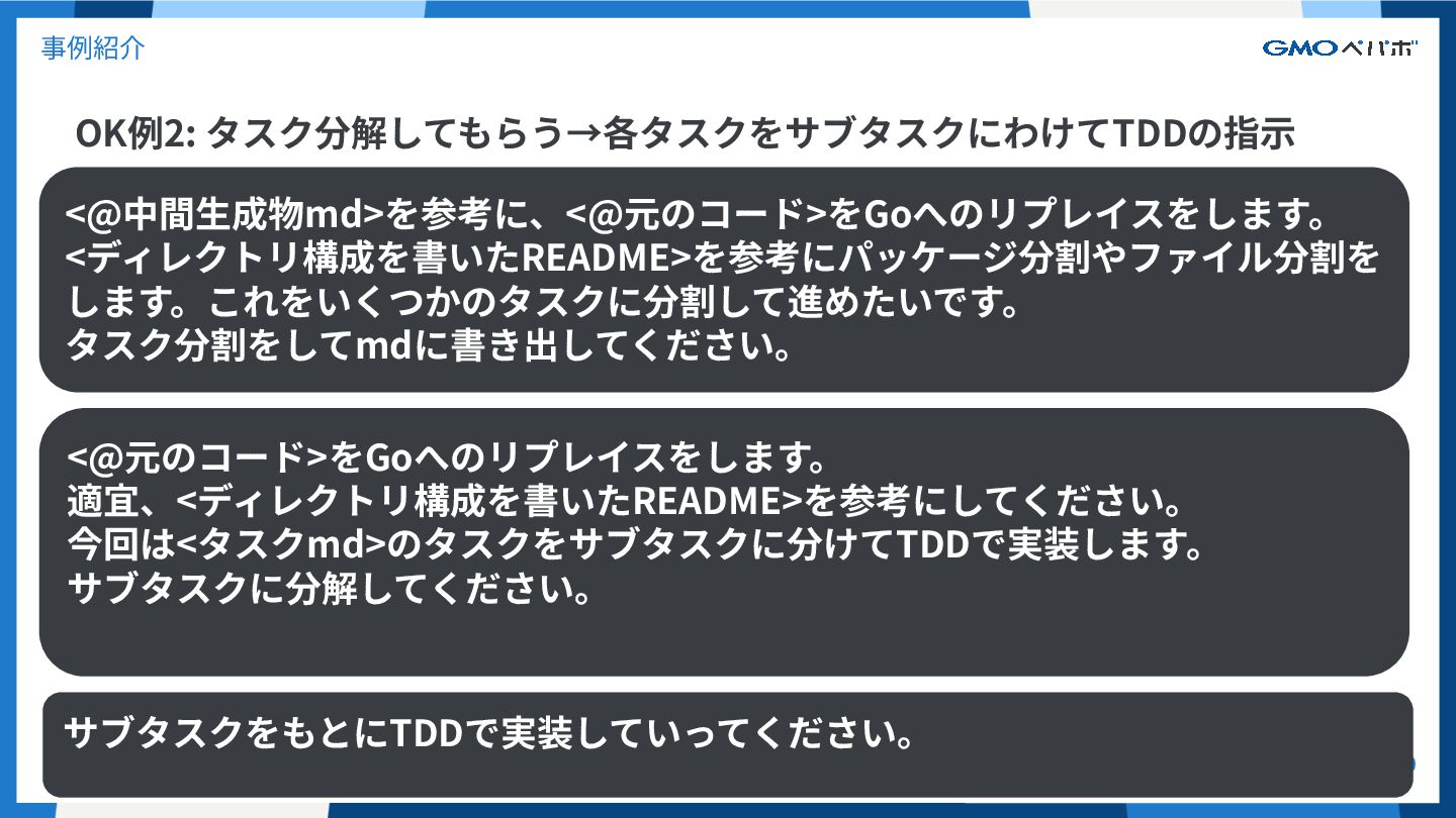 OK例2: タスク分解してもらう→各タスクをサブタスクにわけてTDDの指⽰ 40 事例紹介 <@中間⽣成物md>を参考に、<@元のコード>をGoへのリプレイスをします。 <ディレクトリ構成を書いたREADME>を参考にパッケージ分割やファイル分割を します。これをいくつかのタスクに分割して進めたいです。 タスク分割をしてmdに書き出してください。 <@元のコード>をGoへのリプレイスをします。 適宜、<ディレクトリ構成を書いたREADME>を参考にしてください。