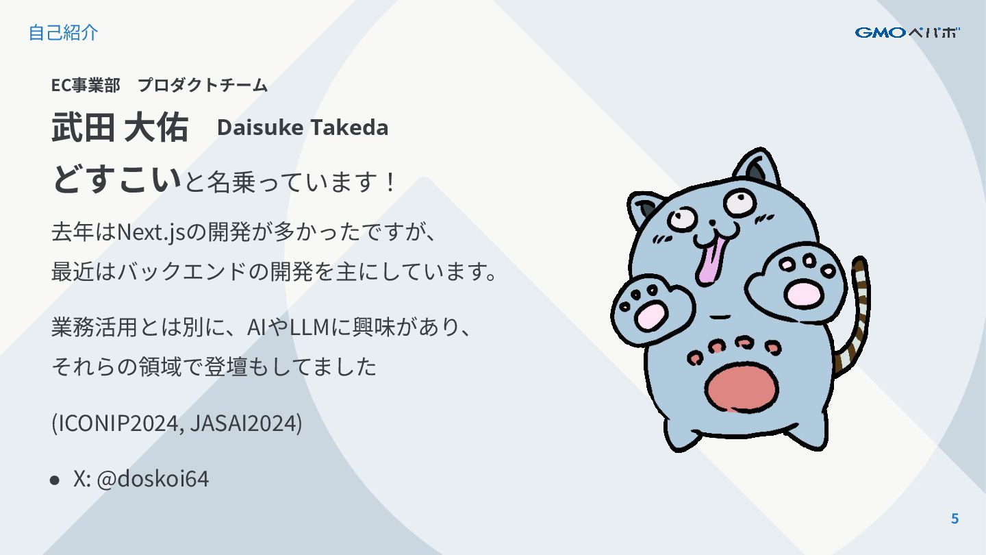 5 ⾃⼰紹介 EC事業部 プロダクトチーム 武⽥ ⼤佑 Daisuke Takeda どすこいと名乗っています! 去年はNext.jsの開発が多かったですが、 最近はバックエンドの開発を主にしています。