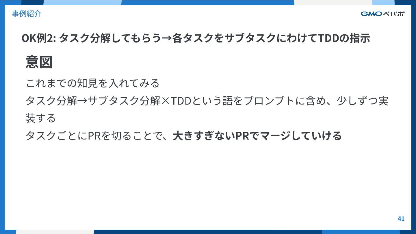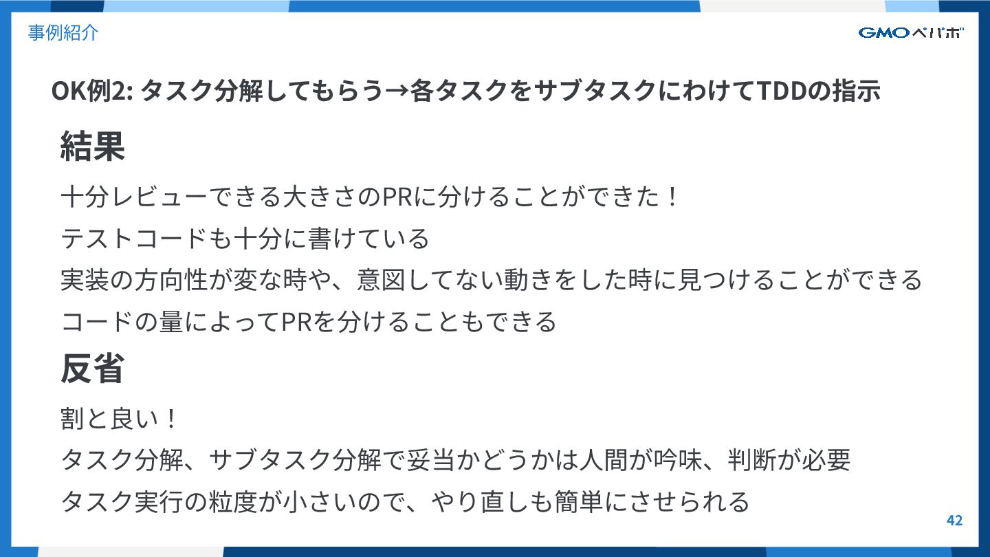 OK例2: タスク分解してもらう→各タスクをサブタスクにわけてTDDの指⽰ 41 事例紹介 意図 これまでの知⾒を⼊れてみる タスク分解→サブタスク分解×TDDという語をプロンプトに含め、少しずつ実 装する タスクごとにPRを切ることで、⼤きすぎないPRでマージしていける