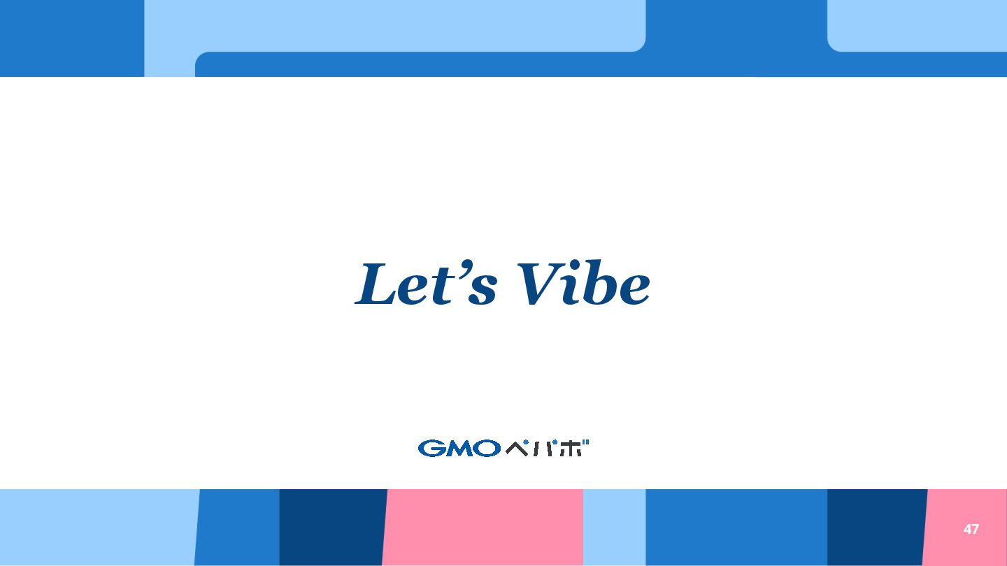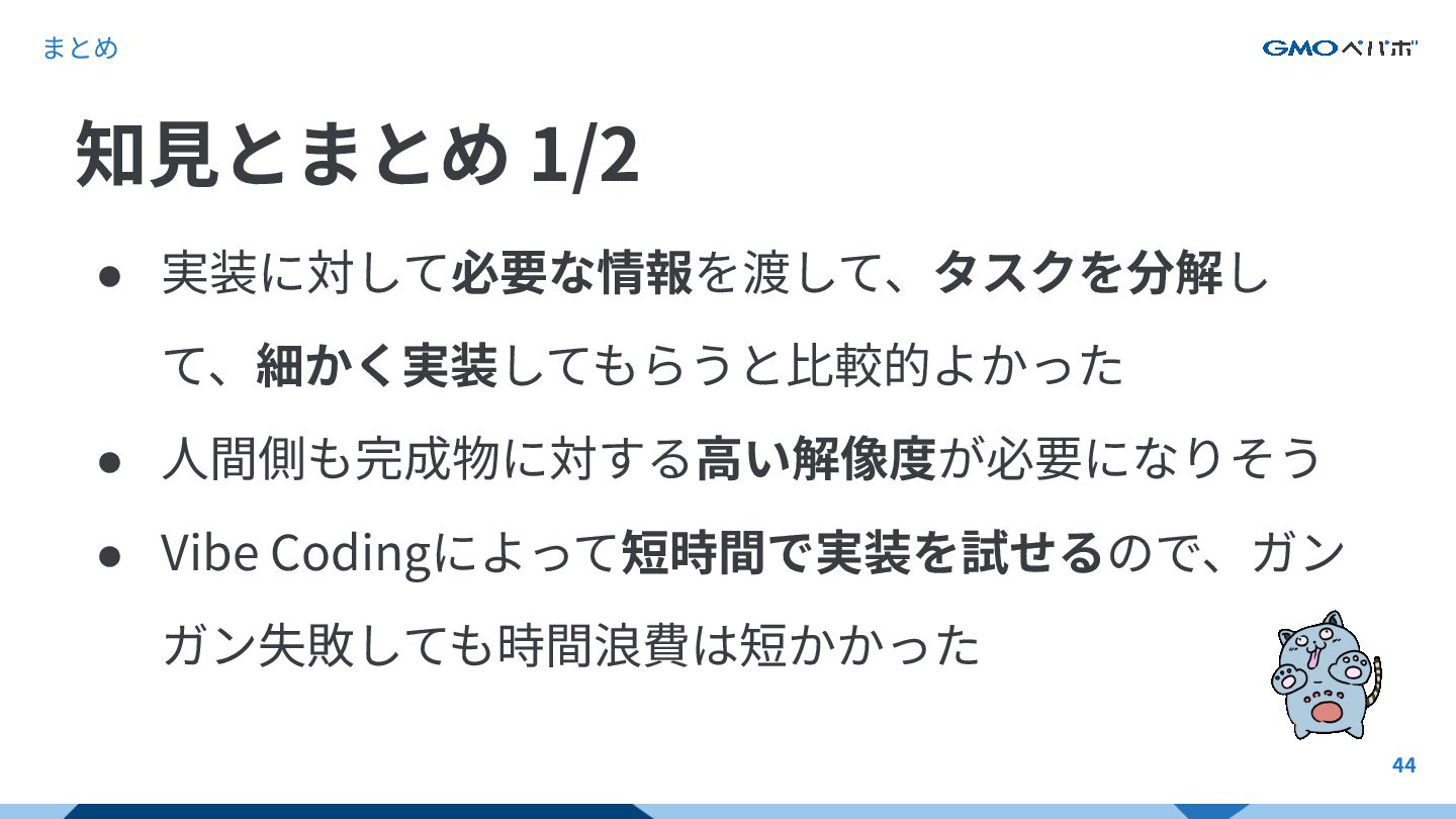 44 • 実装に対して必要な情報を渡して、タスクを分解し て、細かく実装してもらうと⽐較的よかった • ⼈間側も完成物に対する⾼い解像度が必要になりそう • Vibe Codingによって短時間で実装を試せるので、ガン ガン失敗しても時間浪費は短かかった