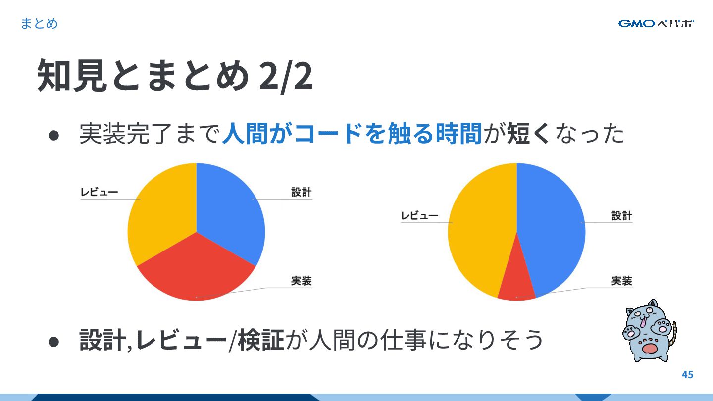45 • 実装完了まで⼈間がコードを触る時間が短くなった • 設計,レビュー/検証が⼈間の仕事になりそう 知⾒とまとめ 2/2 まとめ