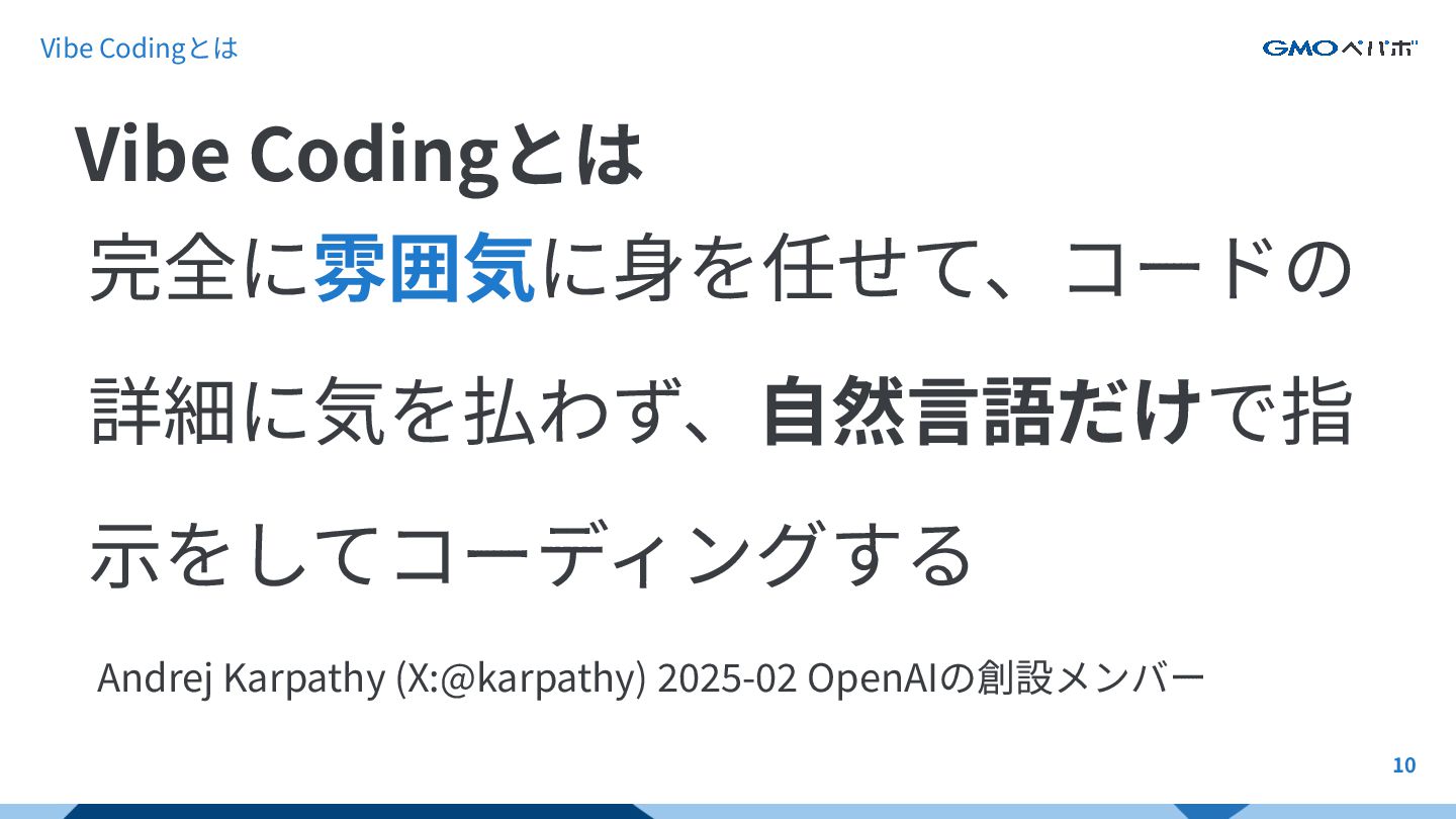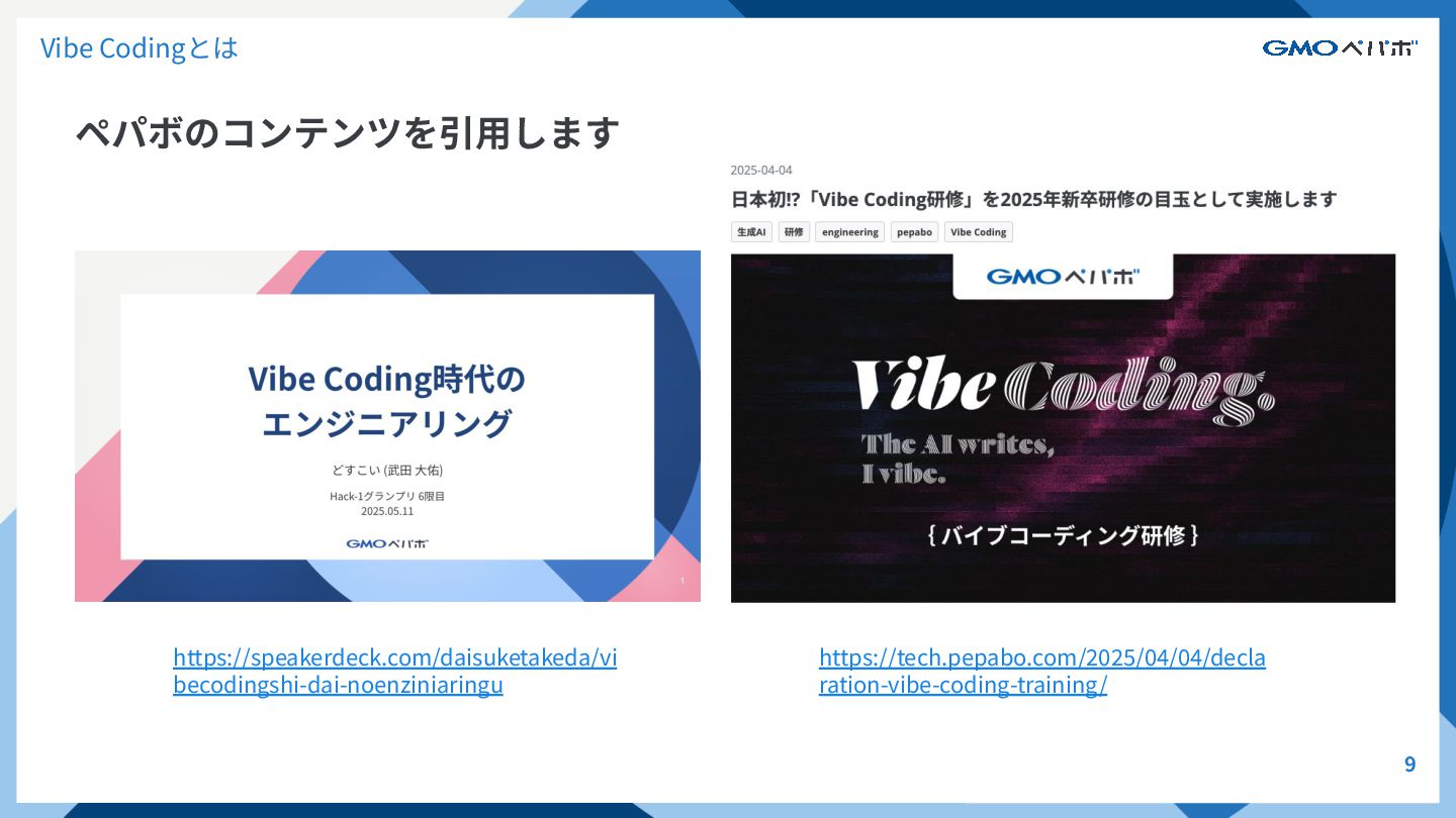 ペパボのコンテンツを引⽤します 9 Vibe Codingとは https://speakerdeck.com/daisuketakeda/vi becodingshi-dai-noenziniaringu https://tech.pepabo.com/2025/04/04/decla ration-vibe-coding-training/
