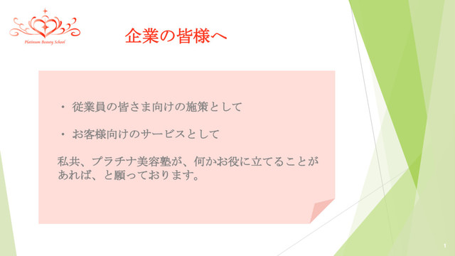 1 ・ 従業員の皆さま向けの施策として ・ お客様向けのサービスとして 私共、プラチナ美容塾が、何かお役に立てることが あれば、と願っております。 企業の皆様へ