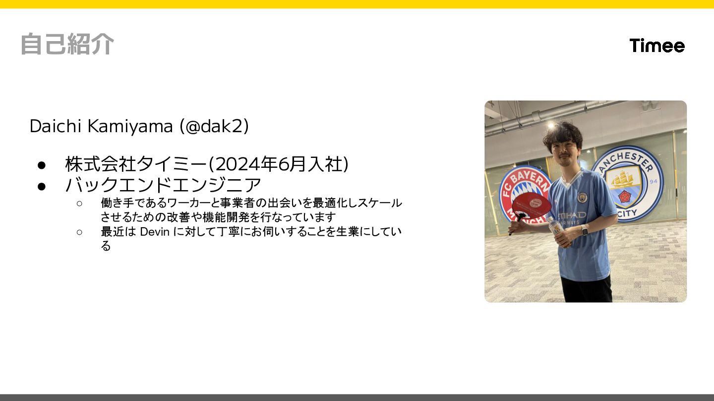 自己紹介 Daichi Kamiyama (@dak2) • 株式会社タイミー(2024年6月入社) • バックエンドエンジニア ◦ 働き手であるワーカーと事業者の出会いを最適化しスケール