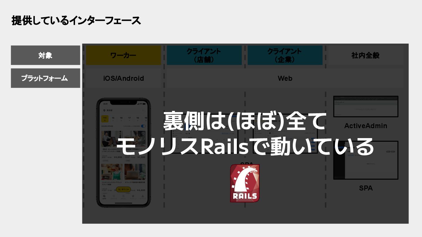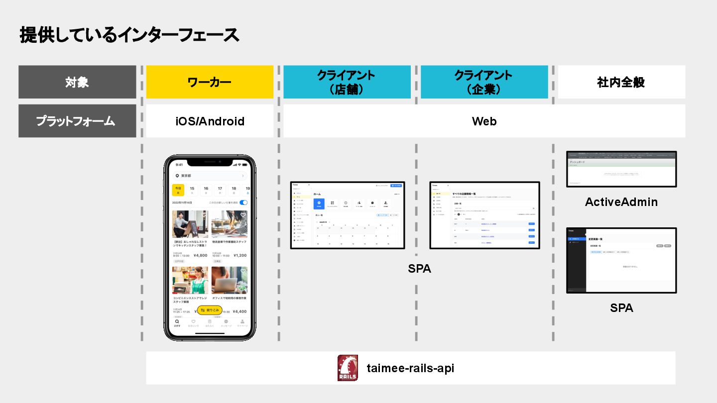 提供しているインターフェース 対象 プラットフォーム iOS/Android ワーカー クライアント (店舗) クライアント (企業) 社内全般