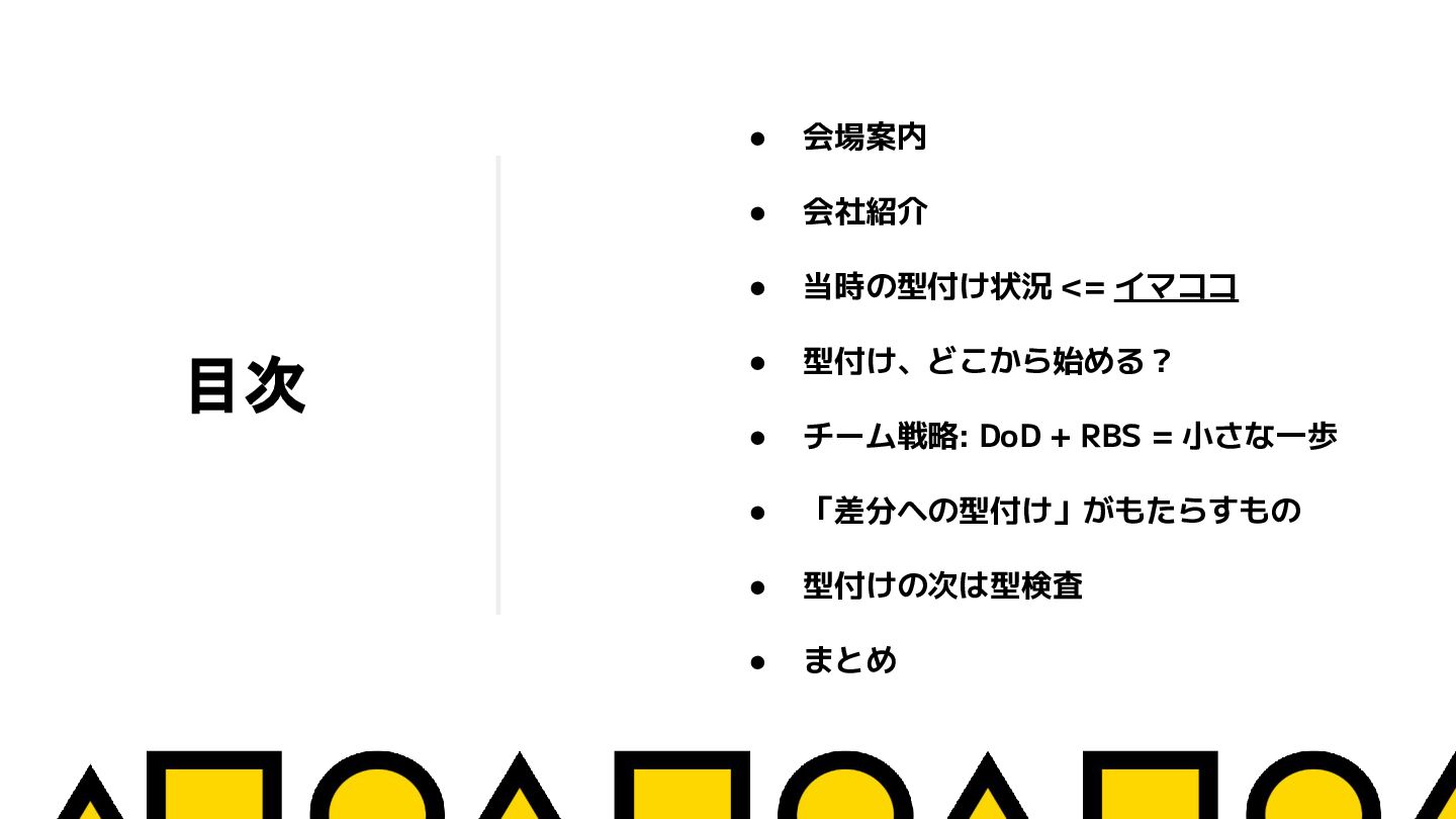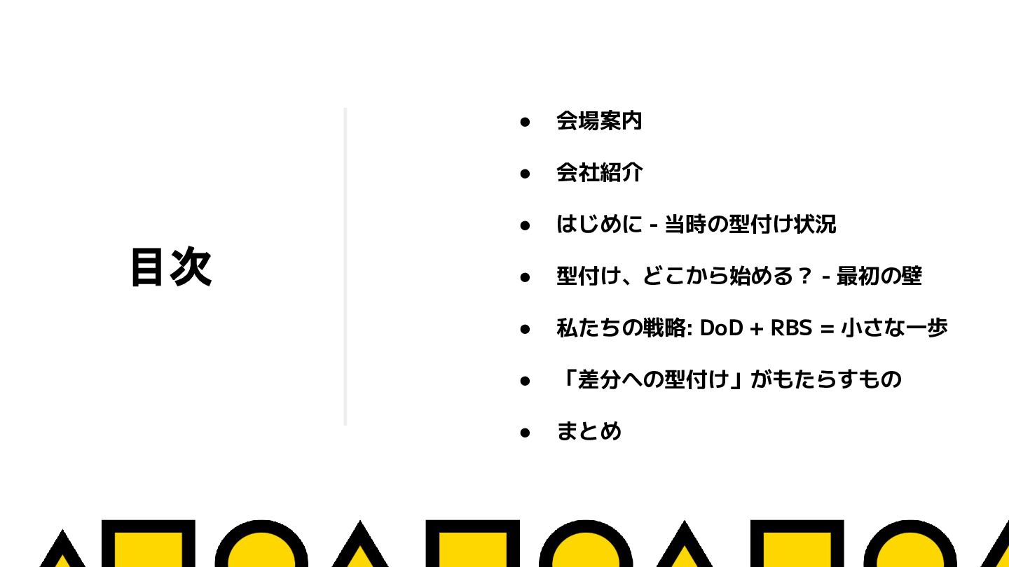 型付け、どこから始める? - 最初の壁 • 私たちの戦略: DoD + RBS = 小さな一歩 • 「差分への型付け」がもたらすもの • まとめ