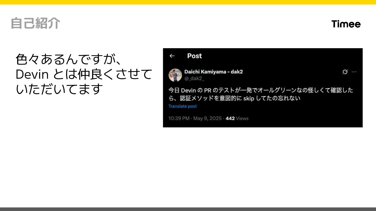 させるための改善や機能開発を行なっています ◦ 最近は Devin に対して丁寧にお伺いすることを生業にしてい る