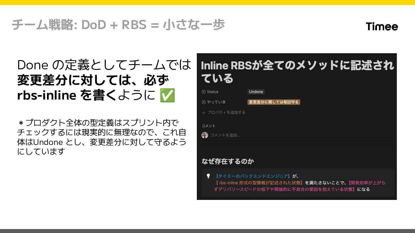 チーム戦略: DoD + RBS = 小さな一歩 Done の定義としてチームでは 変更差分に対しては、必ず rbs-inline