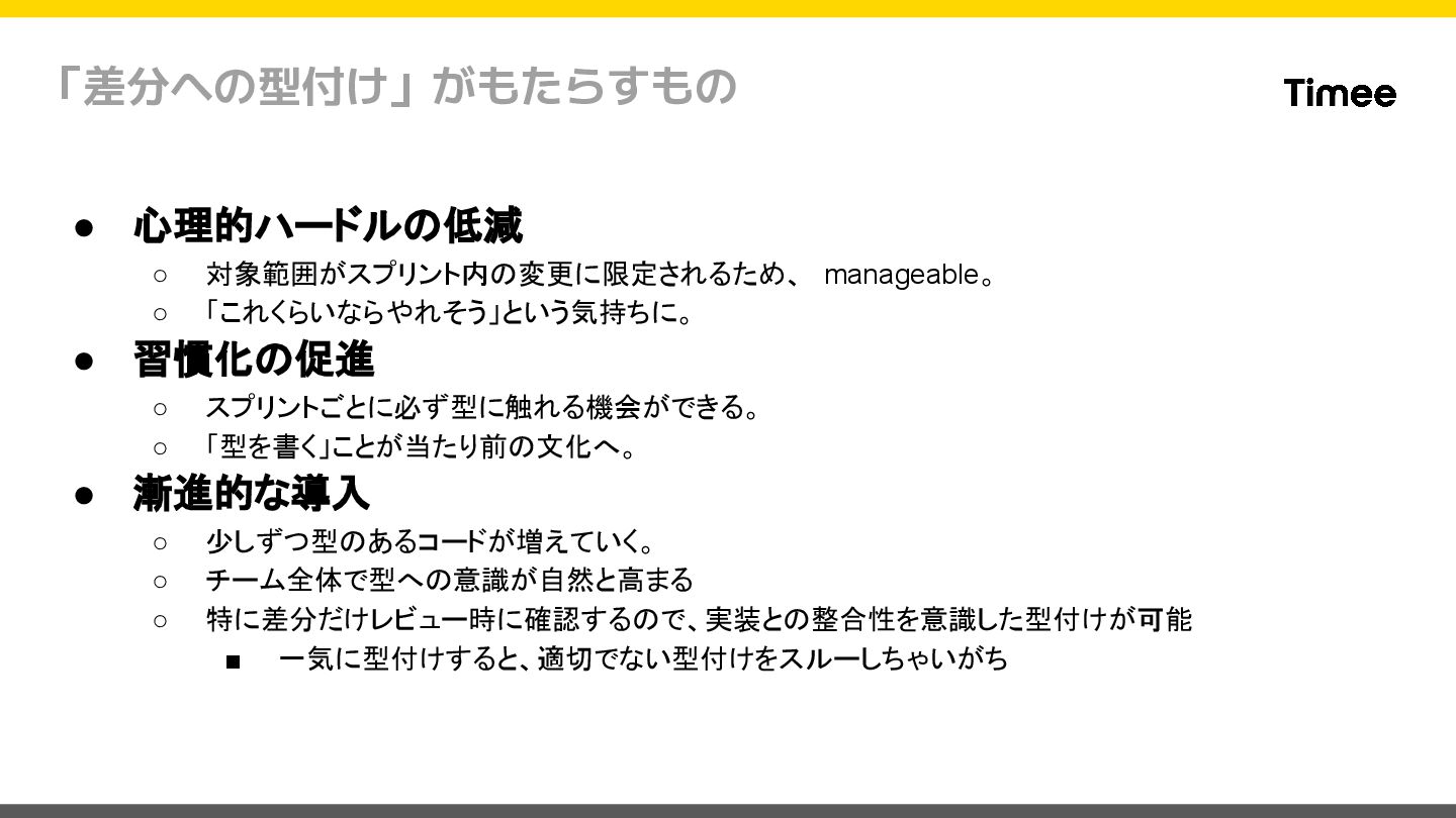 ◦ スプリントごとに必ず型に触れる機会ができる。 ◦ 「型を書く」ことが当たり前の文化へ。 • 漸進的な導入 ◦ 少しずつ型のあるコードが増えていく。 ◦ チーム全体で型への意識が自然と高まる ◦ 特に差分だけレビュー時に確認するので、実装との整合性を意識した型付けが可能 ▪ 一気に型付けすると、適切でない型付けをスルーしちゃいがち