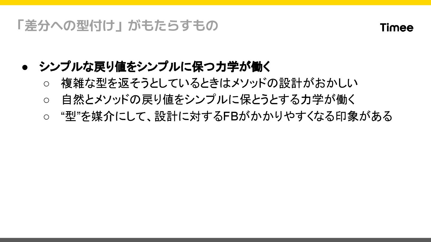 「差分への型付け」がもたらすもの • シンプルな戻り値をシンプルに保つ力学が働く ◦ 複雑な型を返そうとしているときはメソッドの設計がおかしい ◦ 自然とメソッドの戻り値をシンプルに保とうとする力学が働く ◦ “型”を媒介にして、設計に対するFBがかかりやすくなる印象がある