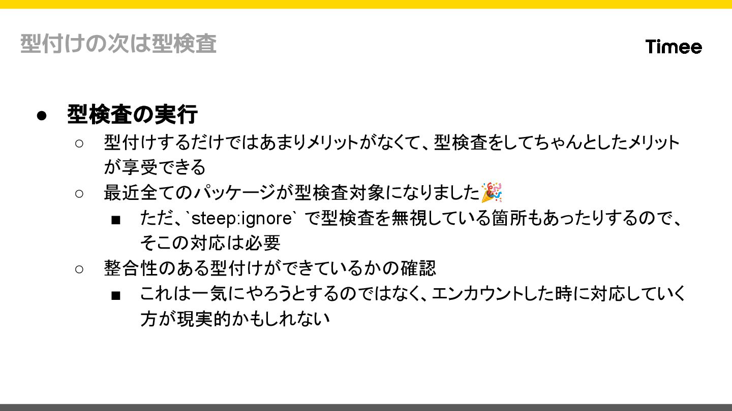 で型検査を無視している箇所もあったりするので、 そこの対応は必要 ◦ 整合性のある型付けができているかの確認 ▪ これは一気にやろうとするのではなく、エンカウントした時に対応していく 方が現実的かもしれない