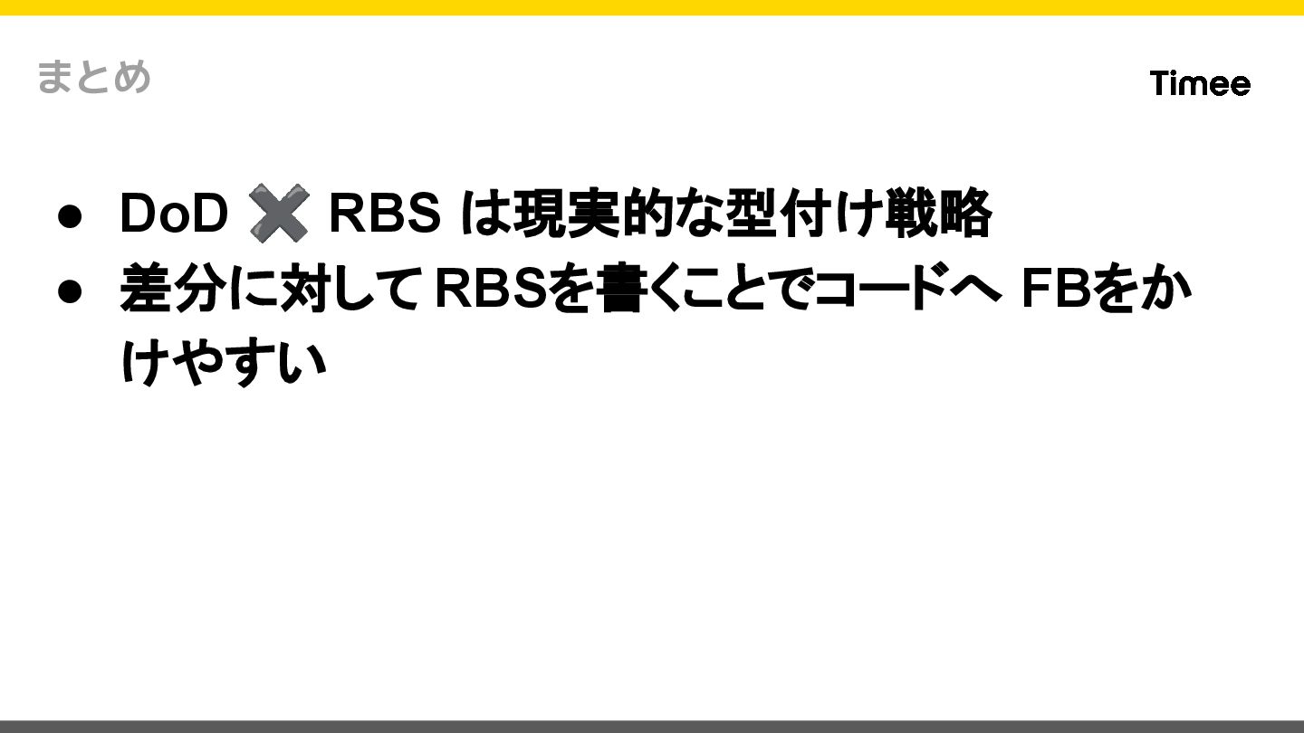 まとめ • DoD ✖ RBS は現実的な型付け戦略 • 差分に対して RBSを書くことでコードへ FBをか
