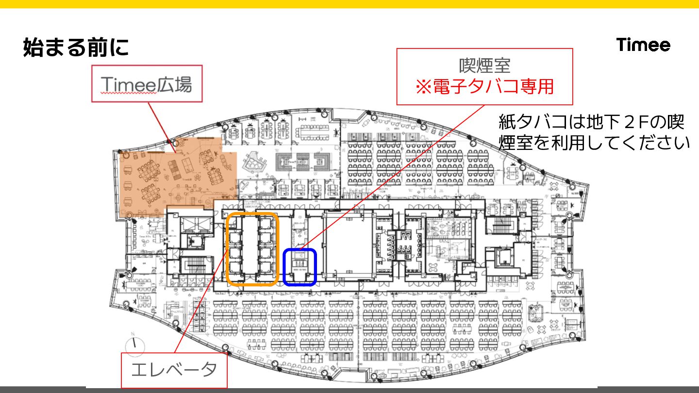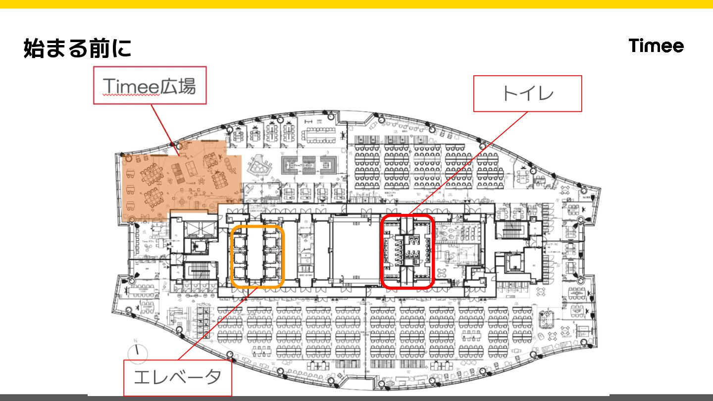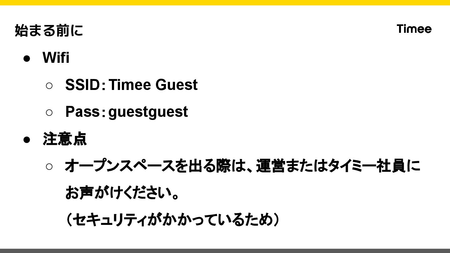 • Wifi ◦ SSID:Timee Guest ◦ Pass:guestguest • 注意点 ◦