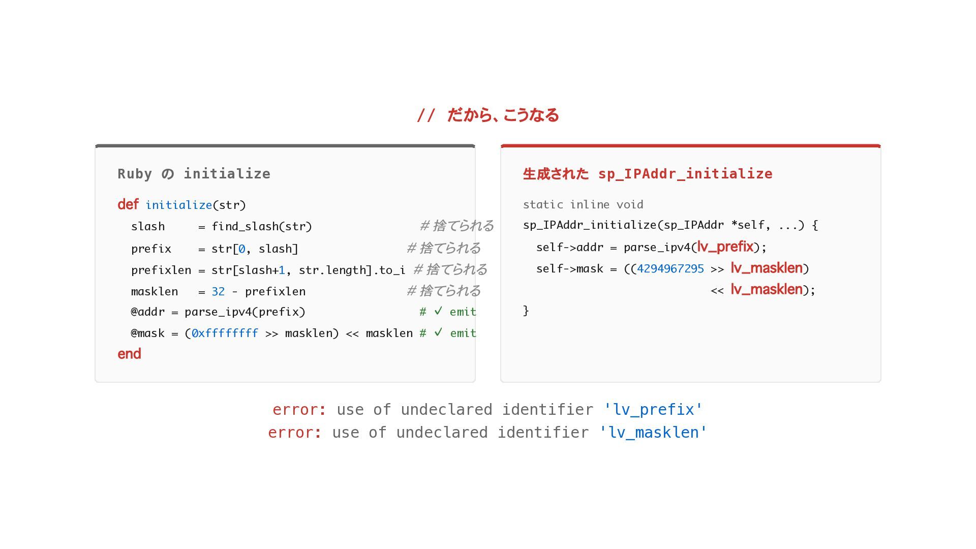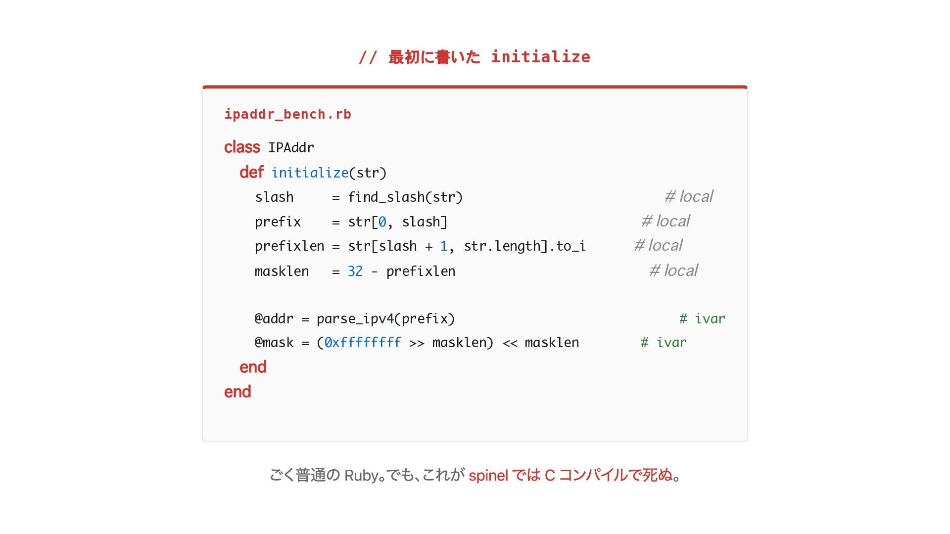 find_slash(str) # local prefix = str[0, slash] # local prefixlen = str[slash + 1, str.length].to_i # local masklen = 32 - prefixlen # local @addr = parse_ipv4(prefix) # ivar @mask = (0xffffffff >> masklen) << masklen # ivar end end ごく普通の Ruby。 でも、 これが spinel では C コンパイルで死ぬ。