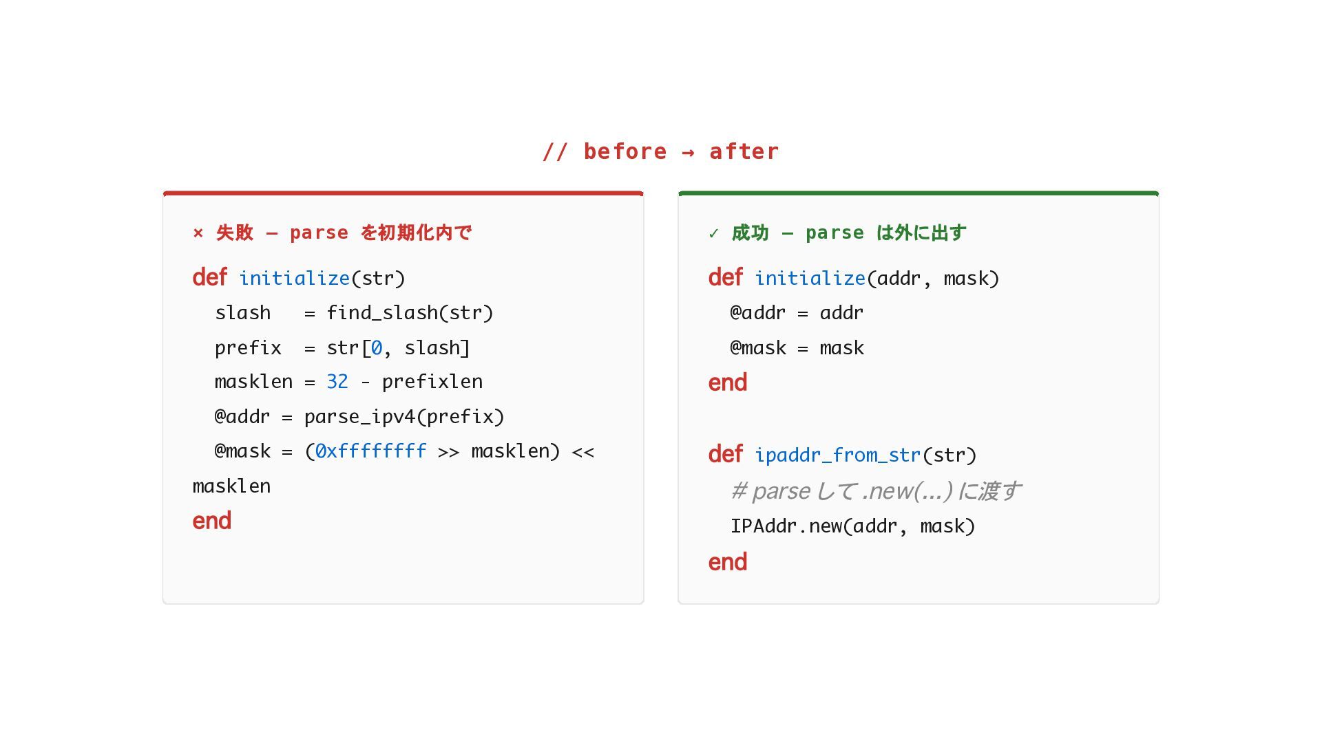 initialize(str) slash = find_slash(str) prefix = str[0, slash] masklen = 32 - prefixlen @addr = parse_ipv4(prefix) @mask = (0xffffffff >> masklen) << masklen end ✓ 成功 — parse は外に出す def initialize(addr, mask) @addr = addr @mask = mask end def ipaddr_from_str(str) # parse して .new(...) に渡す IPAddr.new(addr, mask) end