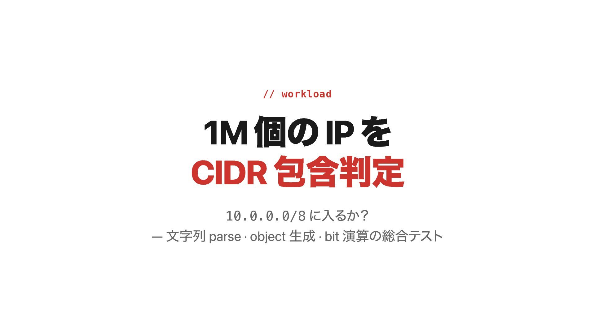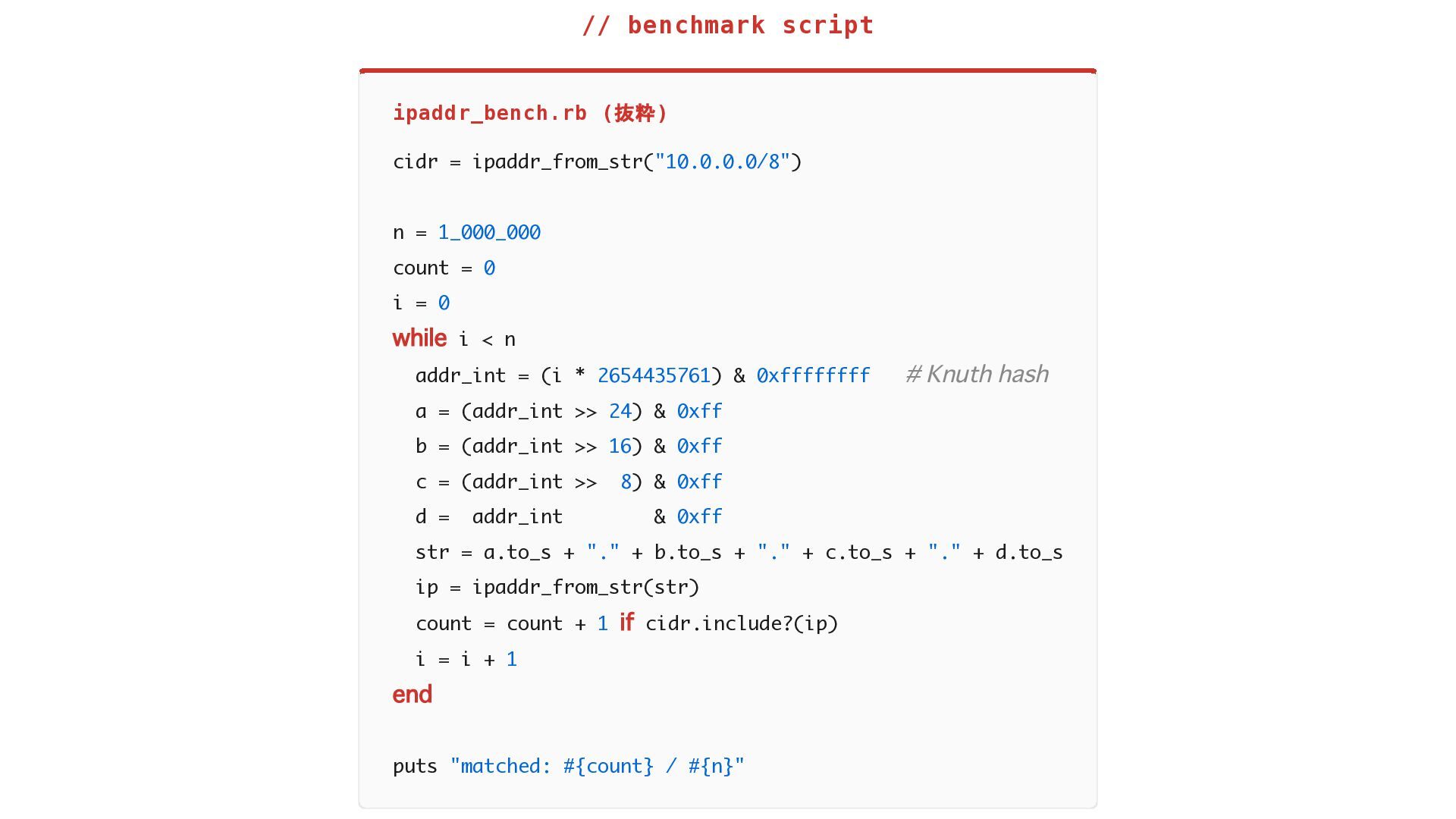 // benchmark script ipaddr_bench.rb (抜粋) cidr = ipaddr_from_str("10.0.0.0/8") n =