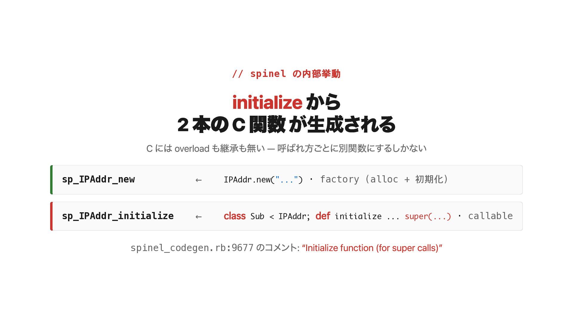C には overload も継承も無い — 呼ばれ方ごとに別関数にするしかない sp_IPAddr_new ← IPAddr.new("...") · factory (alloc + 初期化) sp_IPAddr_initialize ← class Sub < IPAddr; def initialize ... super(...) · callable spinel_codegen.rb:9677 のコメント: “Initialize function (for super calls)”