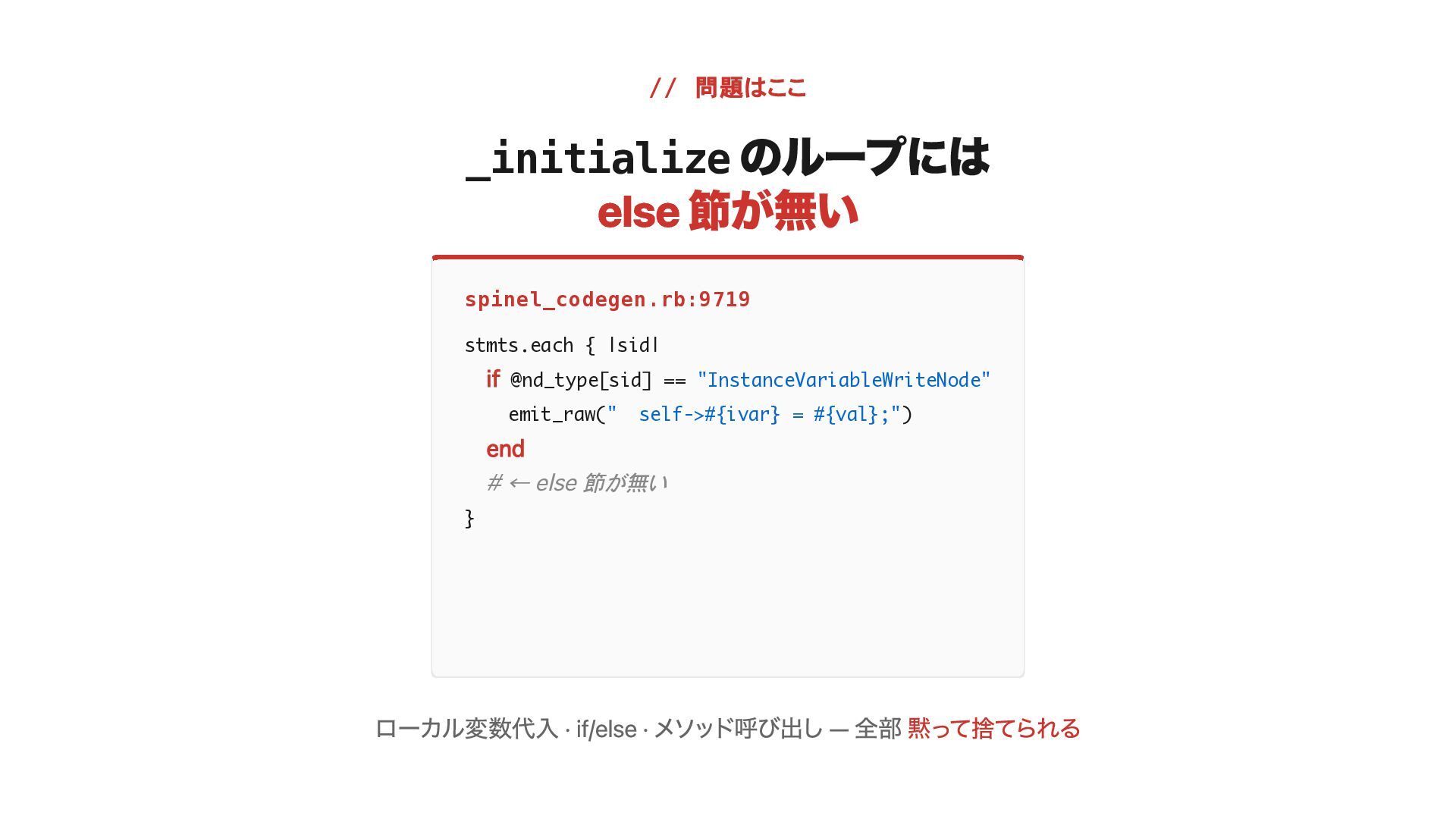 if @nd_type[sid] == "InstanceVariableWriteNode" emit_raw(" self->#{ivar} = #{val};") end # ← else 節が無い } ローカル変数代入 · if/else · メソッド呼び出し — 全部 黙って捨てられる