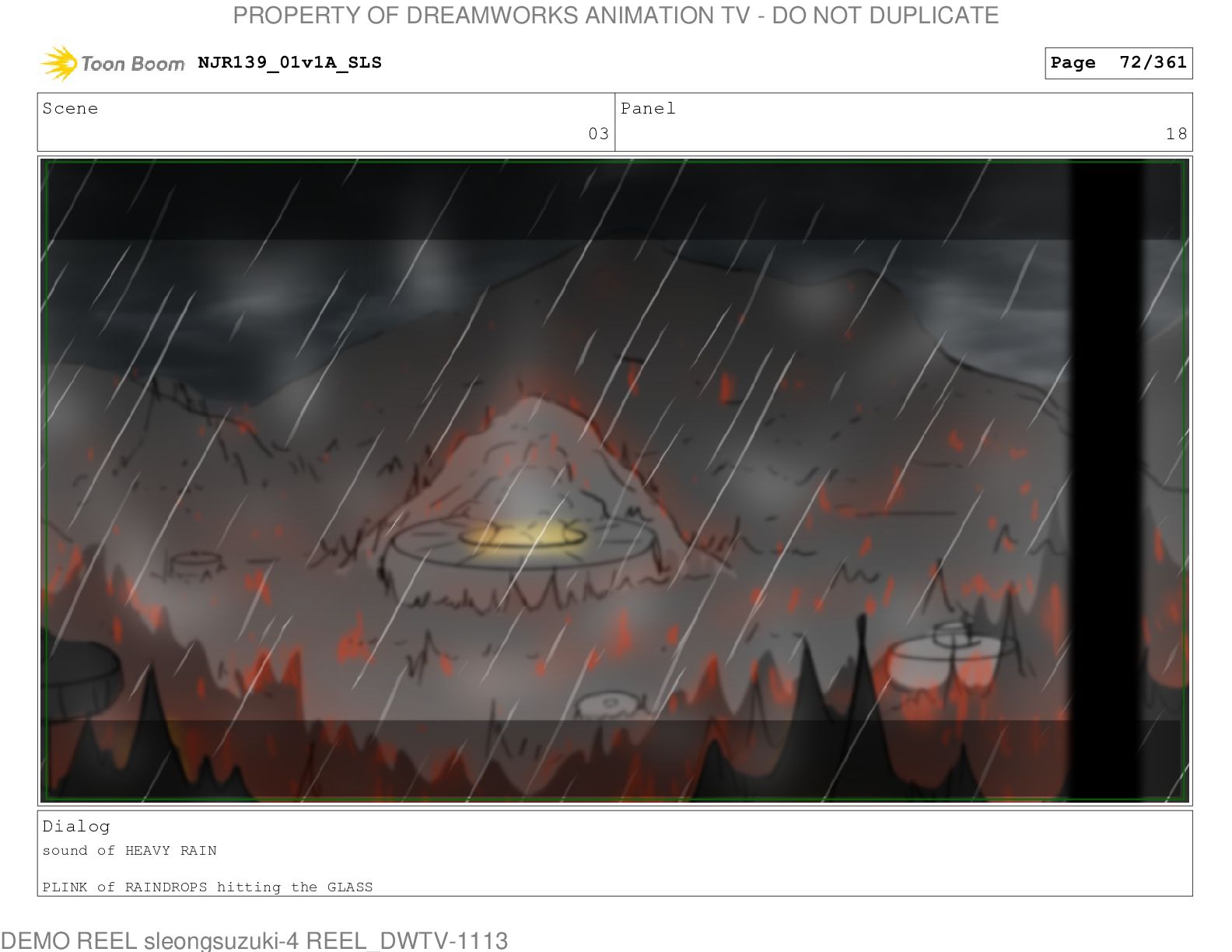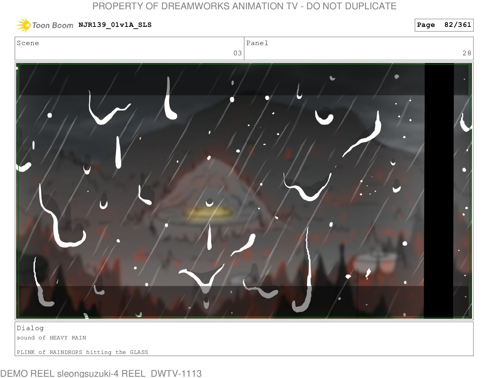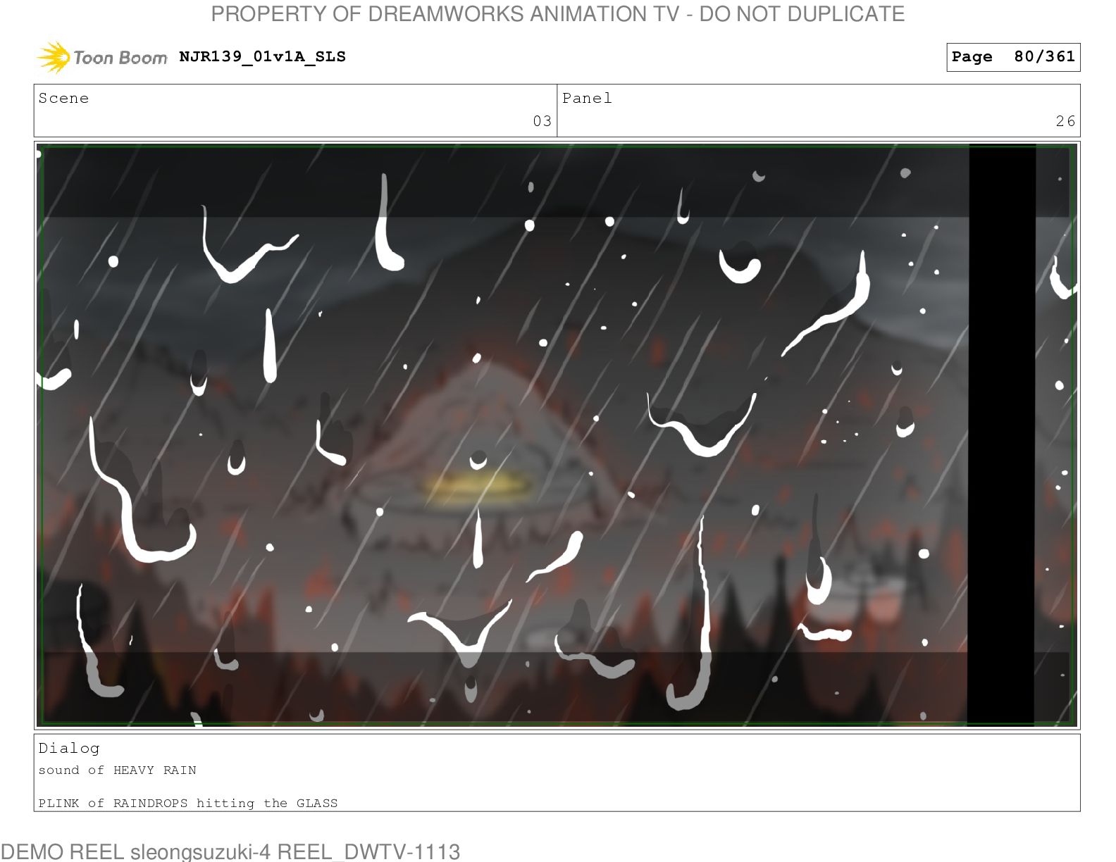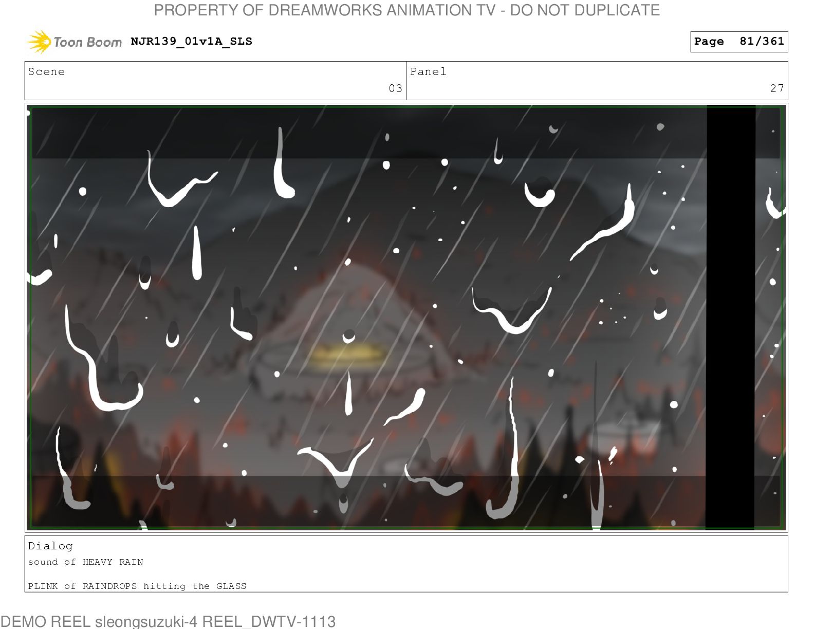 of RAINDROPS hitting the GLASS NJR139_01v1A_SLS Page 72/361 PROPERTY OF DREAMWORKS ANIMATION TV - DO NOT DUPLICATE DEMO REEL sleongsuzuki-4 REEL_DWTV-1113