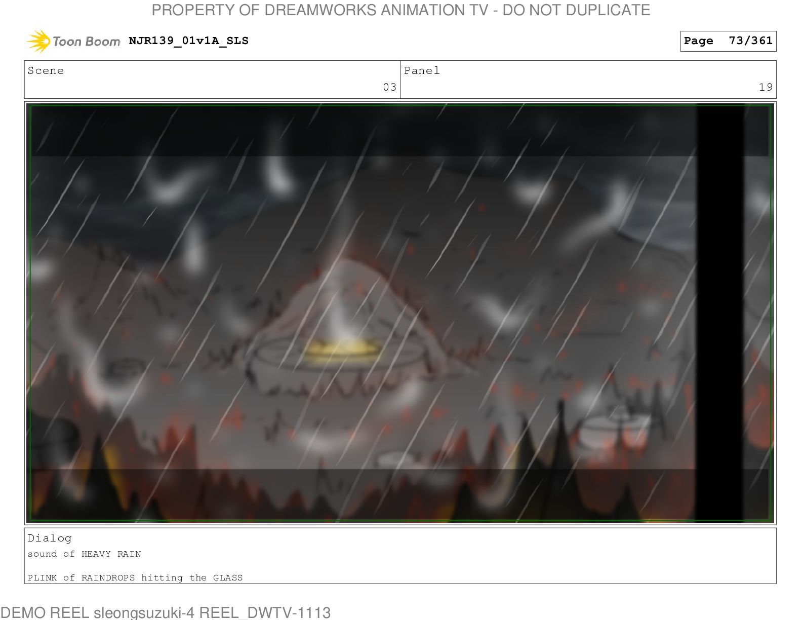 of RAINDROPS hitting the GLASS NJR139_01v1A_SLS Page 73/361 PROPERTY OF DREAMWORKS ANIMATION TV - DO NOT DUPLICATE DEMO REEL sleongsuzuki-4 REEL_DWTV-1113