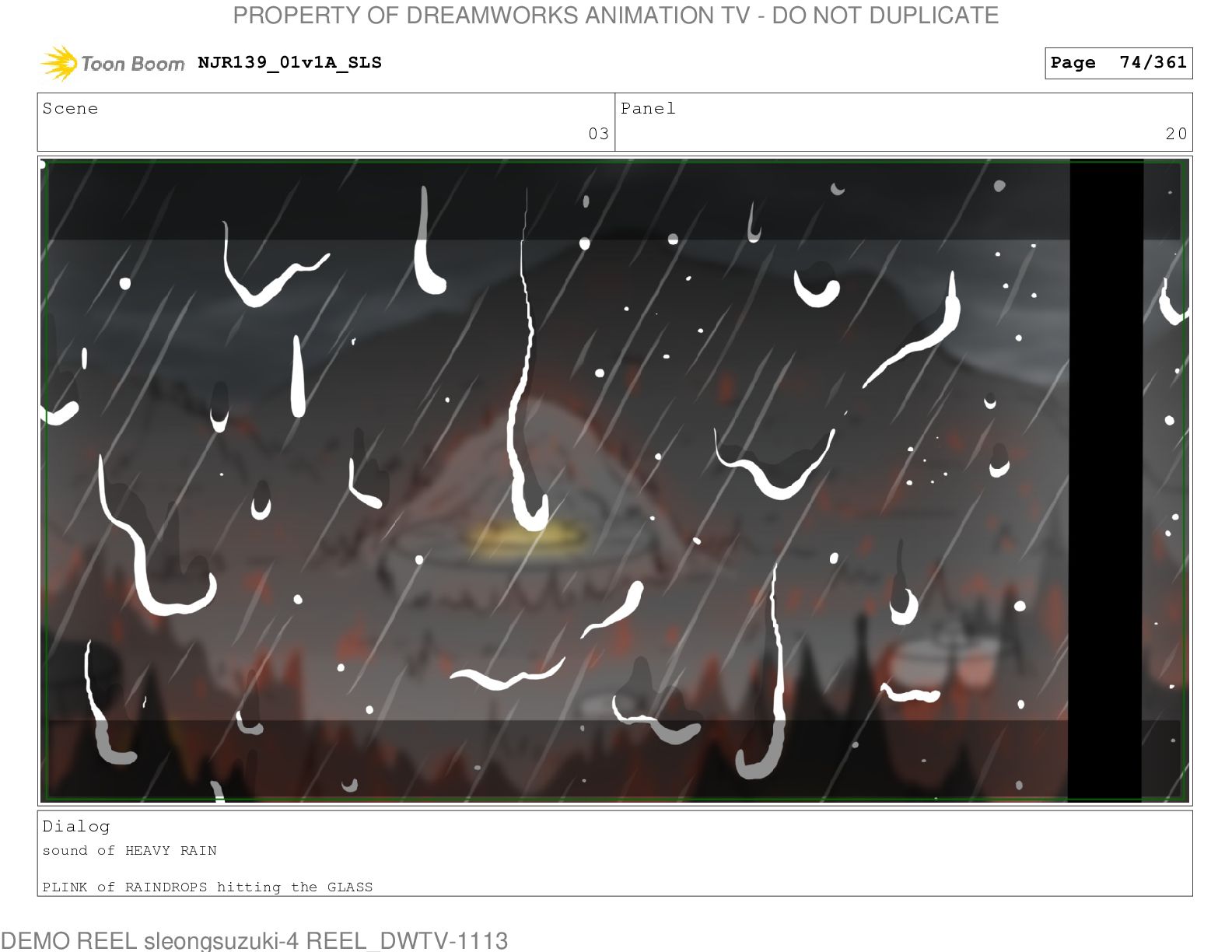 of RAINDROPS hitting the GLASS NJR139_01v1A_SLS Page 74/361 PROPERTY OF DREAMWORKS ANIMATION TV - DO NOT DUPLICATE DEMO REEL sleongsuzuki-4 REEL_DWTV-1113