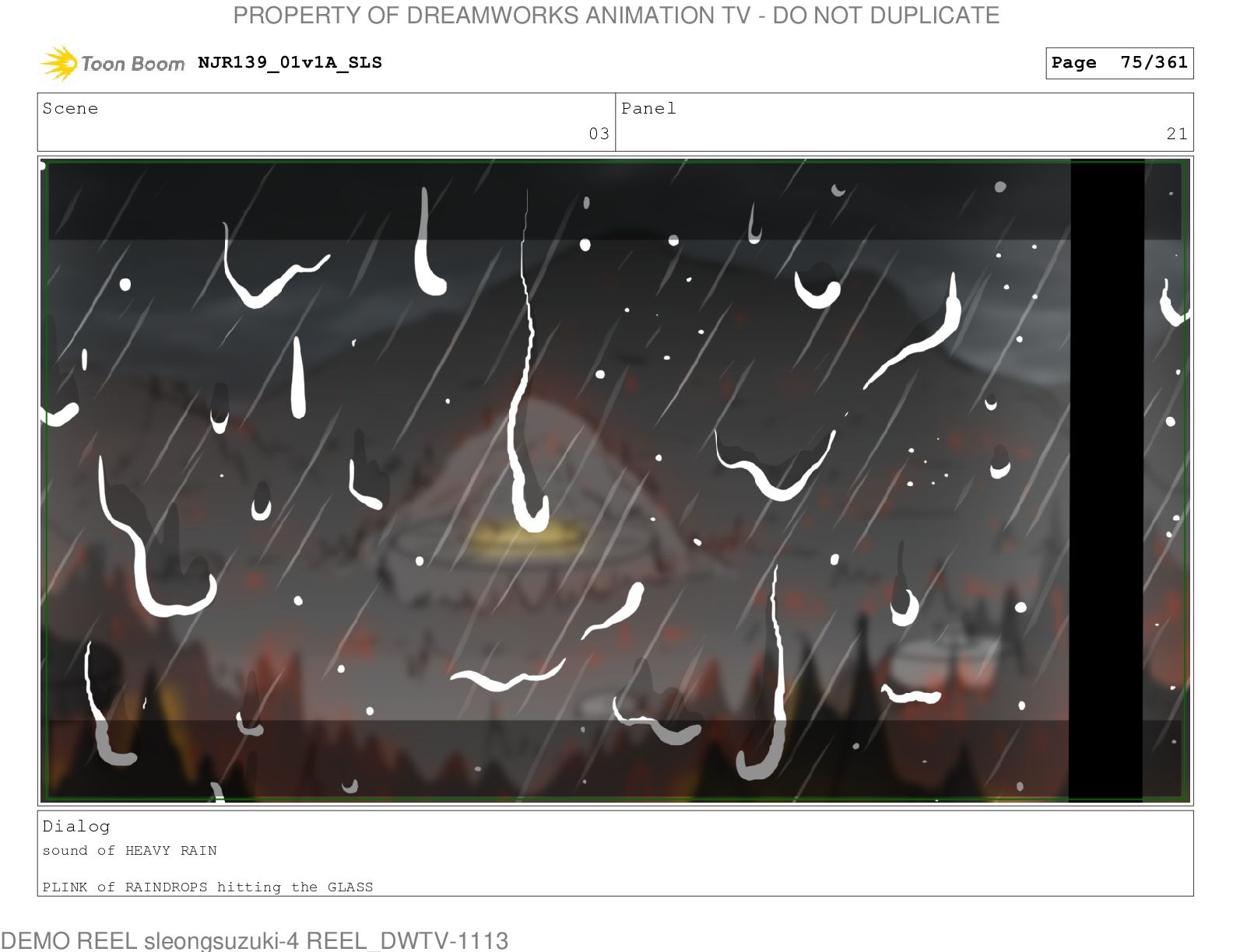of RAINDROPS hitting the GLASS NJR139_01v1A_SLS Page 77/361 PROPERTY OF DREAMWORKS ANIMATION TV - DO NOT DUPLICATE DEMO REEL sleongsuzuki-4 REEL_DWTV-1113