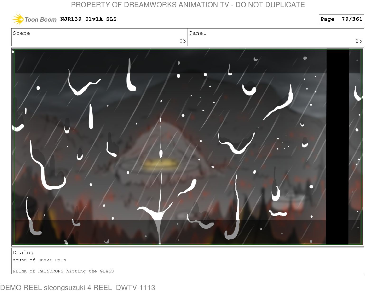 of RAINDROPS hitting the GLASS NJR139_01v1A_SLS Page 79/361 PROPERTY OF DREAMWORKS ANIMATION TV - DO NOT DUPLICATE DEMO REEL sleongsuzuki-4 REEL_DWTV-1113
