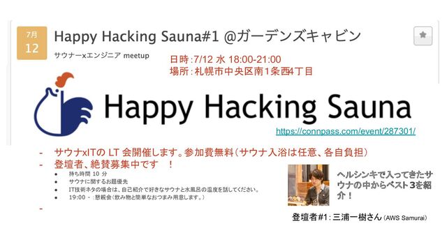 分 • サウナに関するお題優先 • IT技術ネタの場合は、自己紹介で好きなサウナと水風呂の温度を話してください。 • 19:00 - :懇親会(飲み物と簡単なおつまみ用意します。) - 日時:7/12 水 18:00-21:00 場所:札幌市中央区南1条西4丁目 https://connpass.com/event/287301/ 登壇者#1:三浦一樹さん(AWS Samurai) ヘルシンキで入ってきたサ ウナの中からベスト3を紹 介!