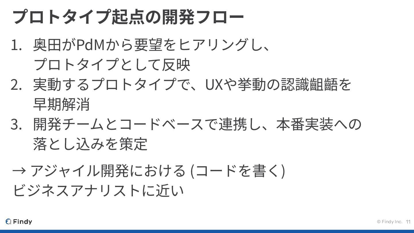 © Findy Inc. プロトタイプ起点の開発フロー 11 1. 奥⽥がPdMから要望をヒアリングし、 プロトタイプとして反映 2. 実動するプロトタイプで、UXや挙動の認識齟齬を