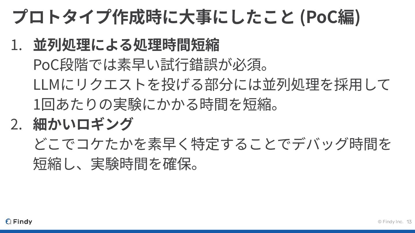 © Findy Inc. プロトタイプ作成時に⼤事にしたこと (PoC編) 13 1. 並列処理による処理時間短縮 PoC段階では素早い試⾏錯誤が必須。 LLMにリクエストを投げる部分には並列処理を採⽤して