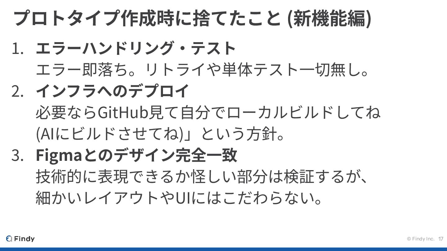 © Findy Inc. プロトタイプ作成時に⼤事にしたこと (新機能編) 16 1. 既存技術スタックとの整合性 テーブル定義やUIライブラリは本番準拠のものを使い、 細かい部分も含めた実現可能性を担保。