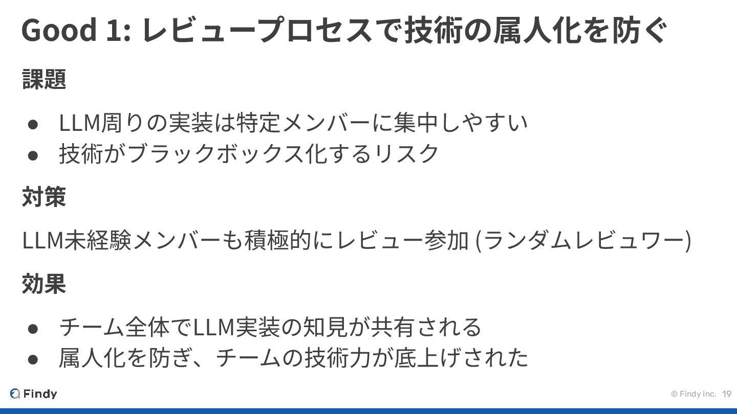 © Findy Inc. Good 1: レビュープロセスで技術の属⼈化を防ぐ 19 課題 • LLM周りの実装は特定メンバーに集中しやすい